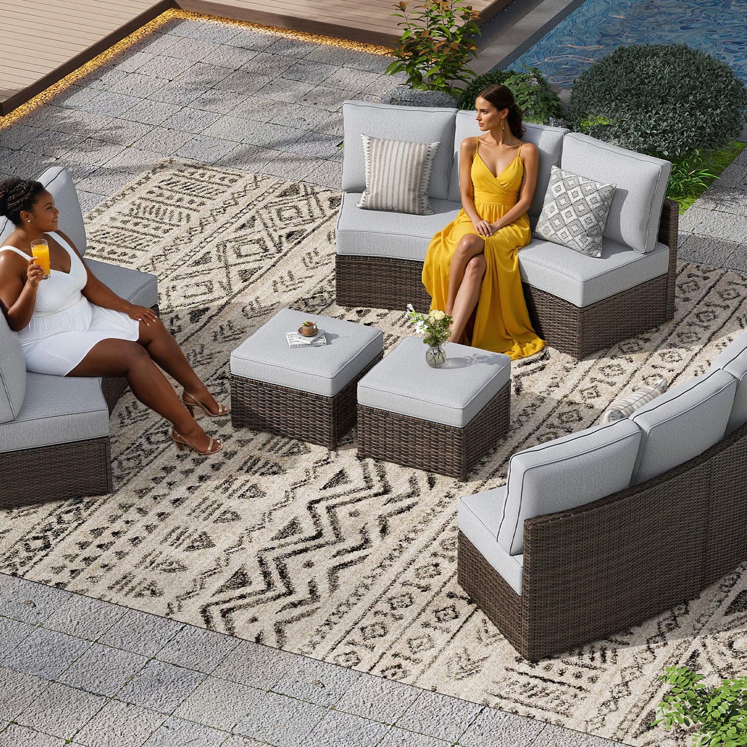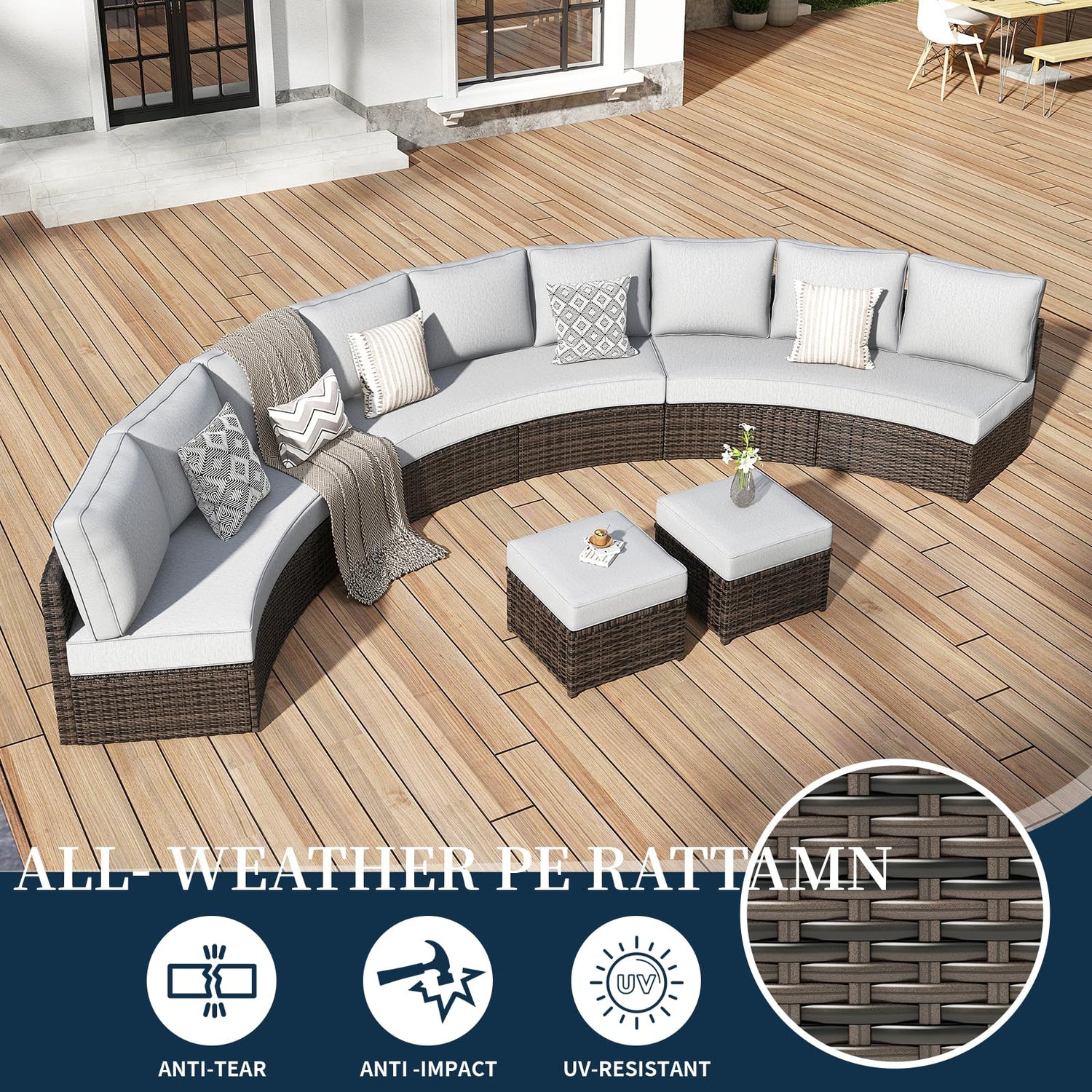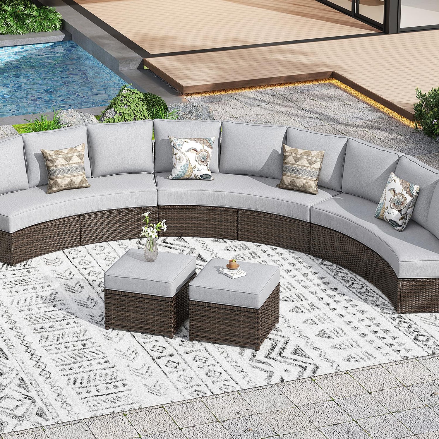 - Outdoor Furniture Set: Distinctive half-moon shape with soft cushions and sturdy all-weather rattan; Seats 11 with 3×3-seat sofas (300 lb each) and 2 ottomans (300 lb each); Modern outdoor centerpiece