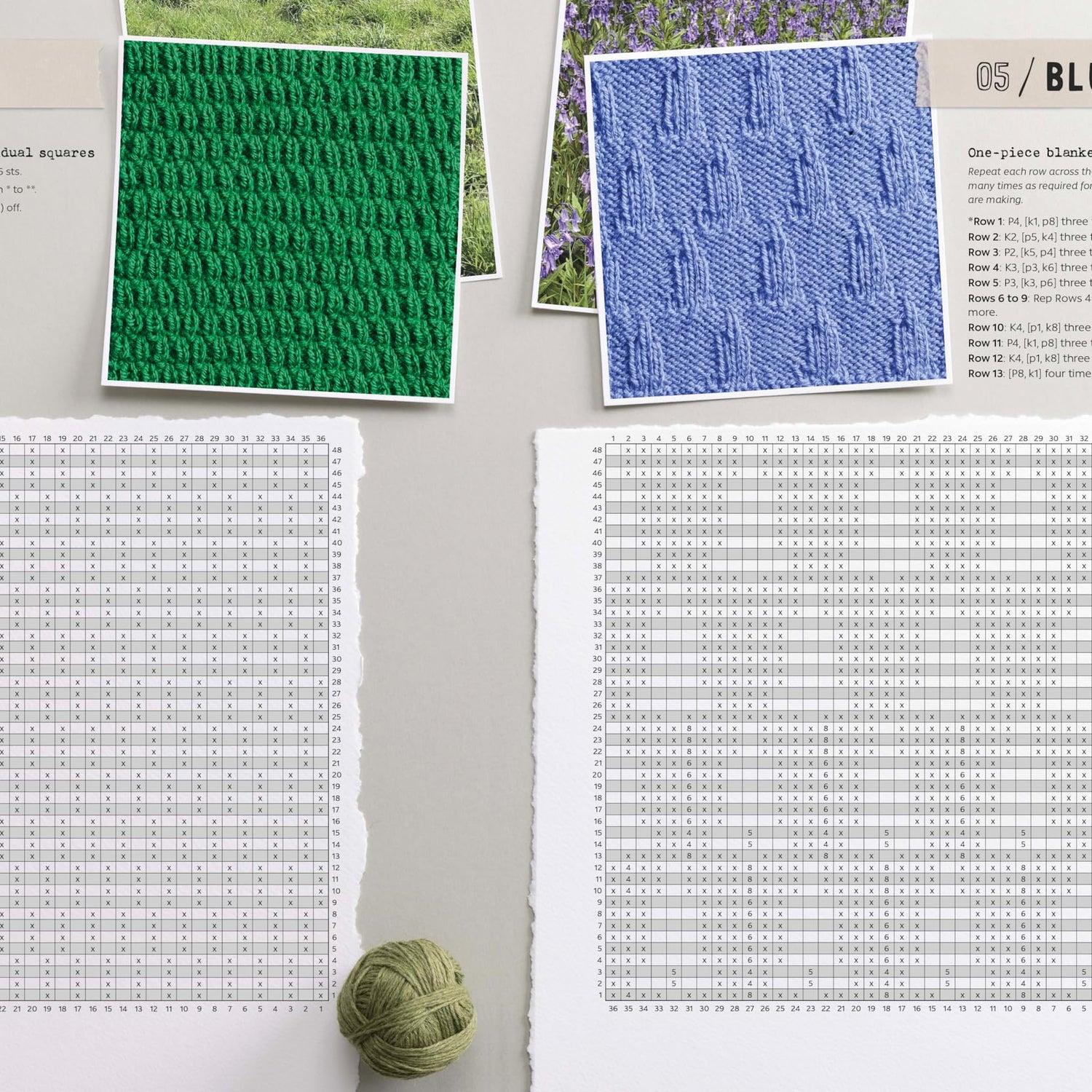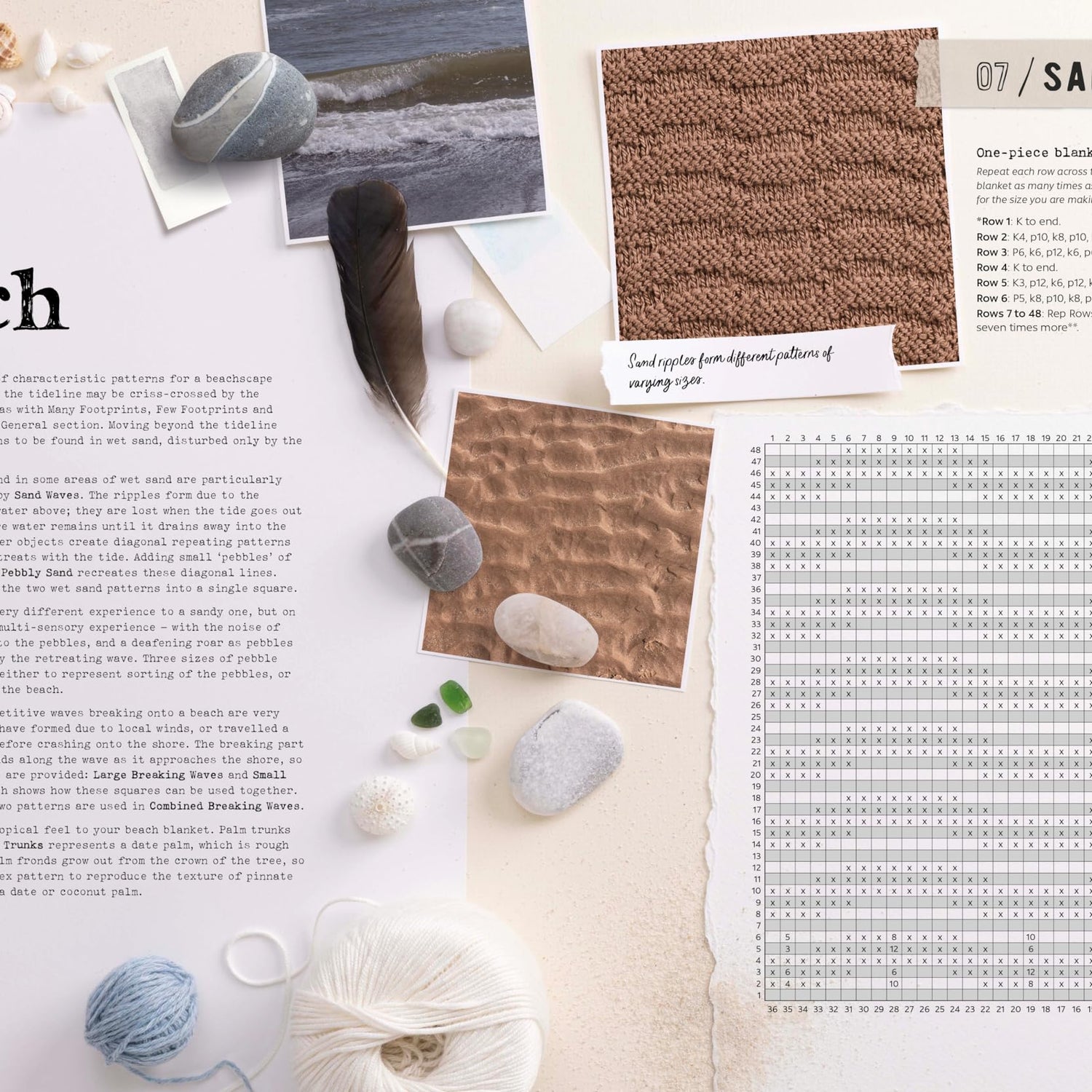 The 50 pattern swatches include wet sand, pebbles, footprints, rain, clouds, different kinds of tree foliage, mountains, sand dunes and more. There are written instructions and numbered charts for each of the landscape swatches, as well as stunning photography showing the inspiration for each of the designs.