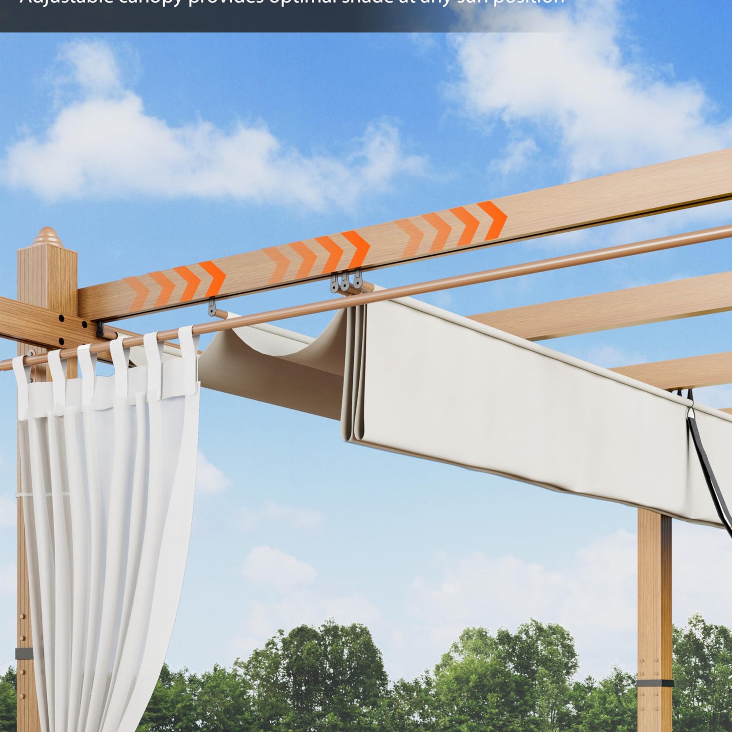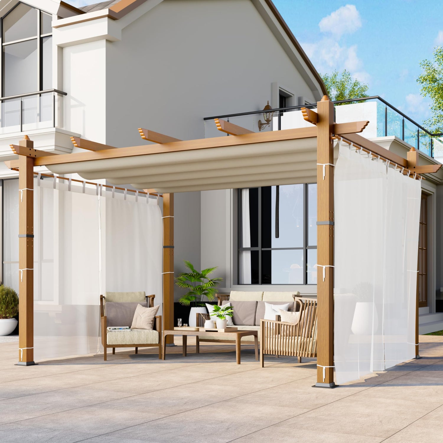 10x13 Ft Outdoor Aluminum Pergola, Upgraded Faux Wood Grain Retractable Pergola with Adjustable Roof & Side Mesh Screen, Modern Metal Patio Gazebo for Deck, Backyard, Porch, Vineyards, Beige + White