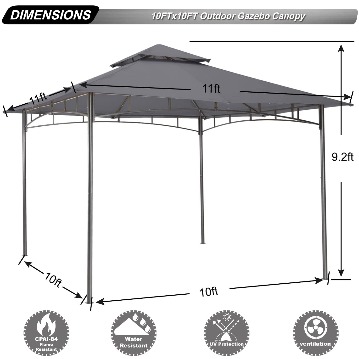 - vented top roof: the two-tier weather resistant polyester roof provides stability in windy conditions, keeps proper airflow and helps reduce heat and wind stress on the canopy. the gazebo cover material is upf 50+ protected, 99% uv blocked, water-resistant, cpai-84 us standard fire-retardant and is perfect for providing shade or rain protection.