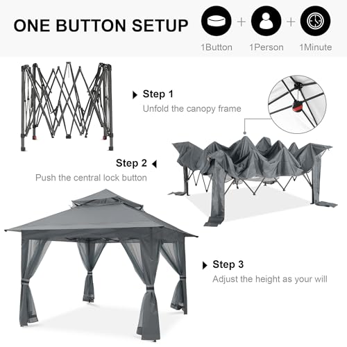 - POP-UP GAZEBO: The latest central lock technology design enables ONE PERSON to easily SET UP and close the canopy in ONE MINUTE BY ONE BUTTON, not only for sports, camping, or trips, but also for patio, backyard, and screen house room. (Not suitable for lightning storm, rainstorm or snowing days use).