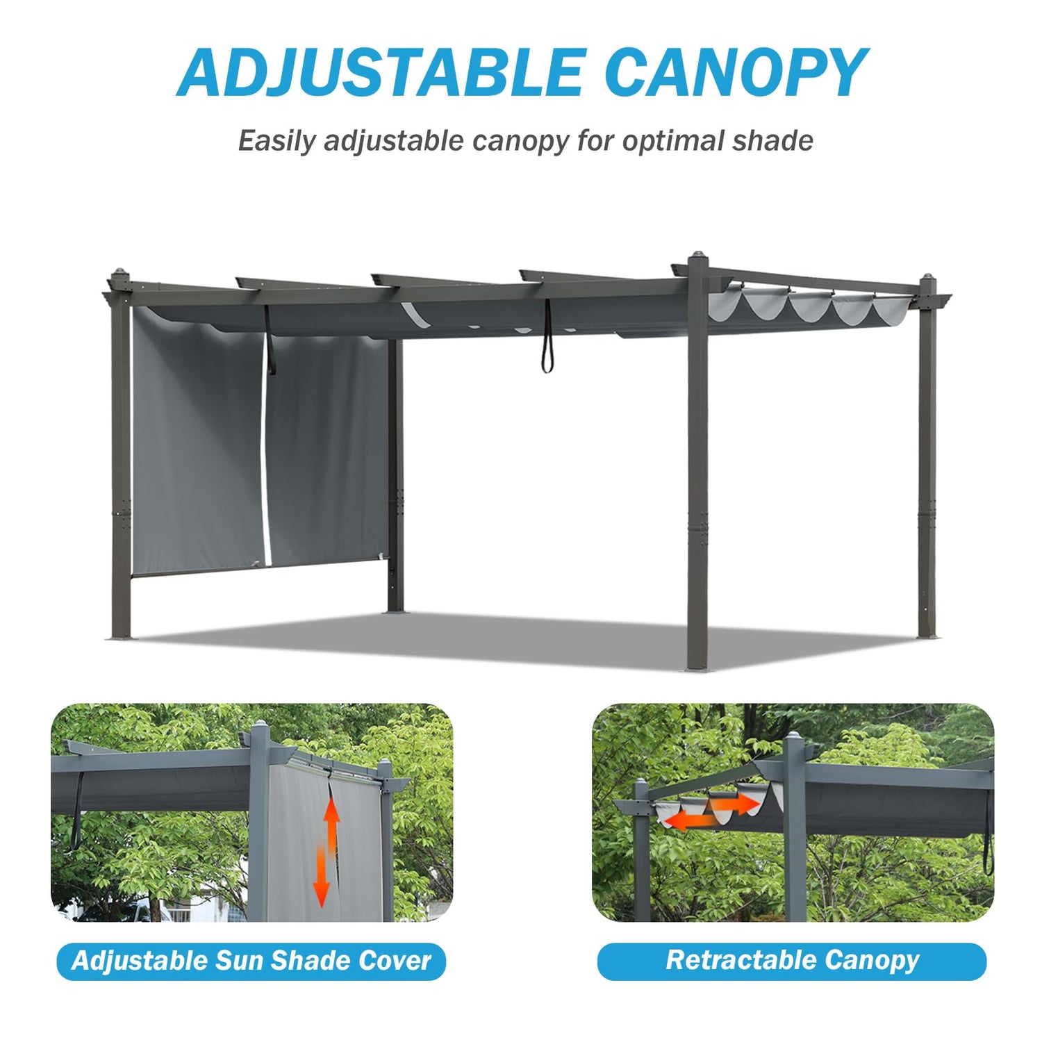 - Practical and Attractive: Enhance your outdoor living with this 12 x 16 Ft pergola featuring two retractable curtains for adjustable shade. Ideal for courtyards, patios