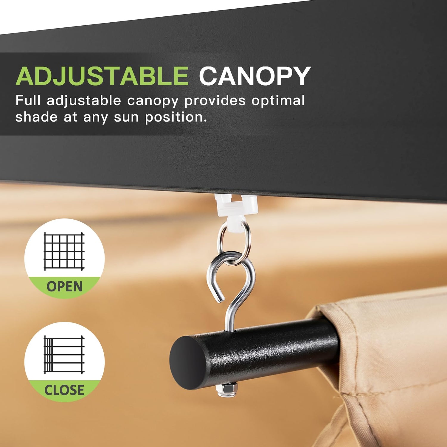 - Retractable Canopy: The top cover can be opened or closed to control sunlight and shade outside. Select PA coated polyester cloth, which has great UV protection and water resistance. Recommended to fold in rainy or snowy. Wind resistance 31-38mph