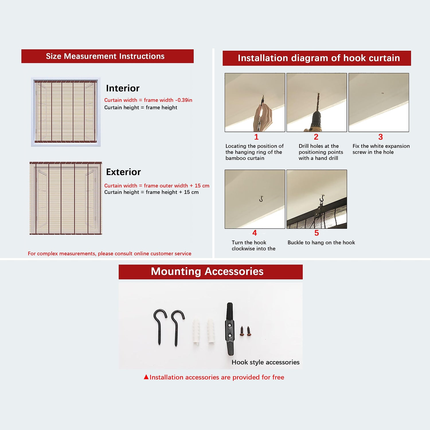 These blinds are perfect for creating privacy without sacrificing natural light. Whether you're looking to enhance your home, office, or leisure spaces, you can easily customise your bamboo blinds. If you can’t find the perfect size, simply refer to the measurement guide, choose the closest fit, and send your size specifications by email at no extra cost.