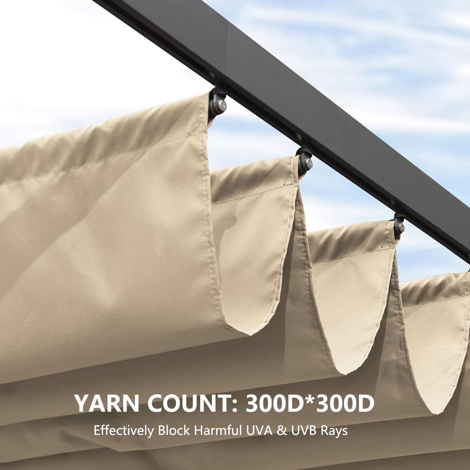 • Excellent UV Protection: The yarn count of heavy-duty fabric material is 300D*300D, which can effectively block 95% UV-ray to protect you from the sun and reduce the temperature under the canopy