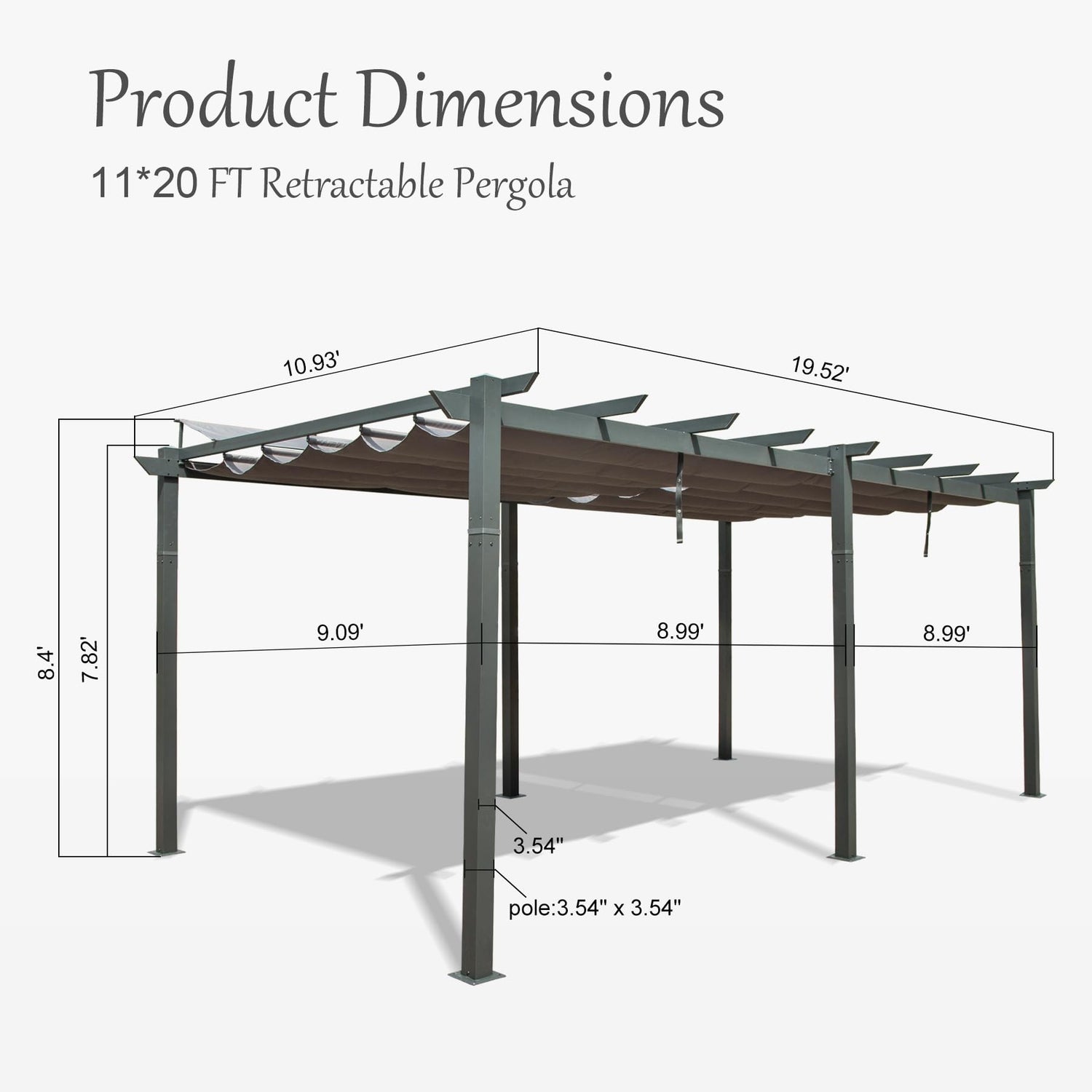 - Premium Fabric- The canopy of 11' x 20' pergola is made of upgraded polyester fabric, which is durable, UV resistant, fade resistant and water-repellent.