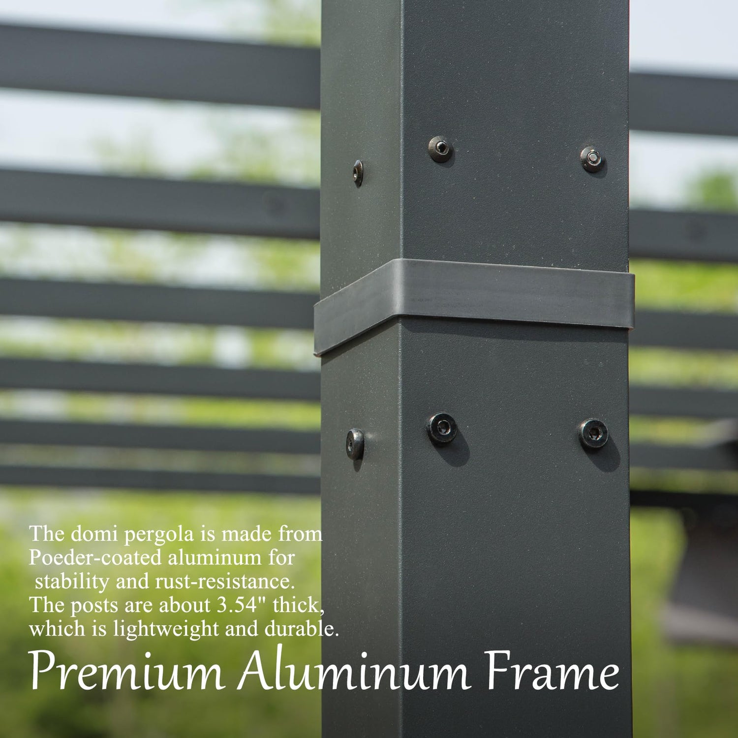 - Aluminum Frame- Domi outdoor pergola is made from powder-coated aluminum for stability and rust-resistance.The posts are about 3.54" thick,which is lightweight and durable.
