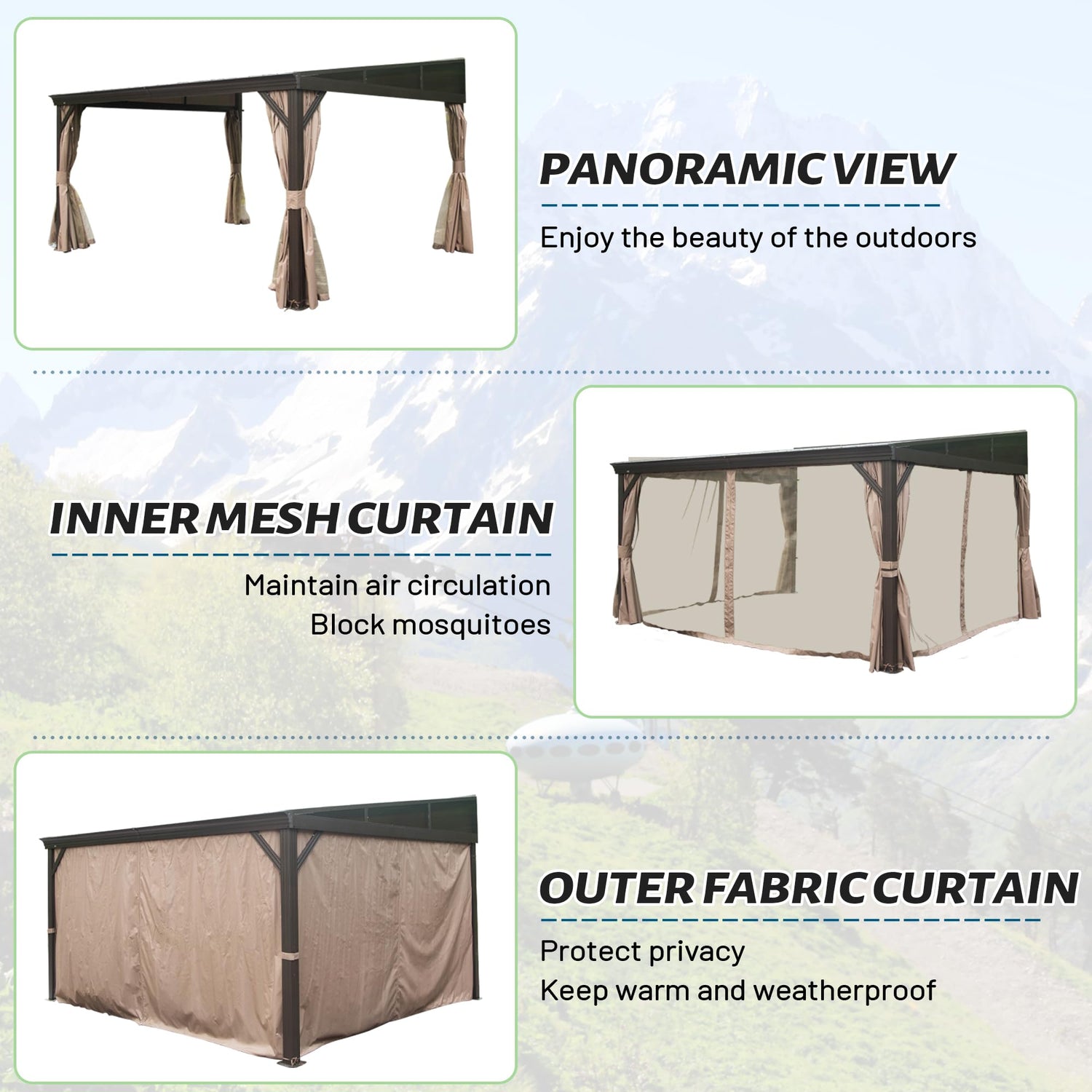 Domi 12x14FT Lean to Gazebo, Aluminum Wall Mounted Gazebo with Sloping Galvanized Steel Roof, Curtains and Netting, Outdoor Hardtop Gazebo Pergola for Patio, Deck, Garden, Backyard