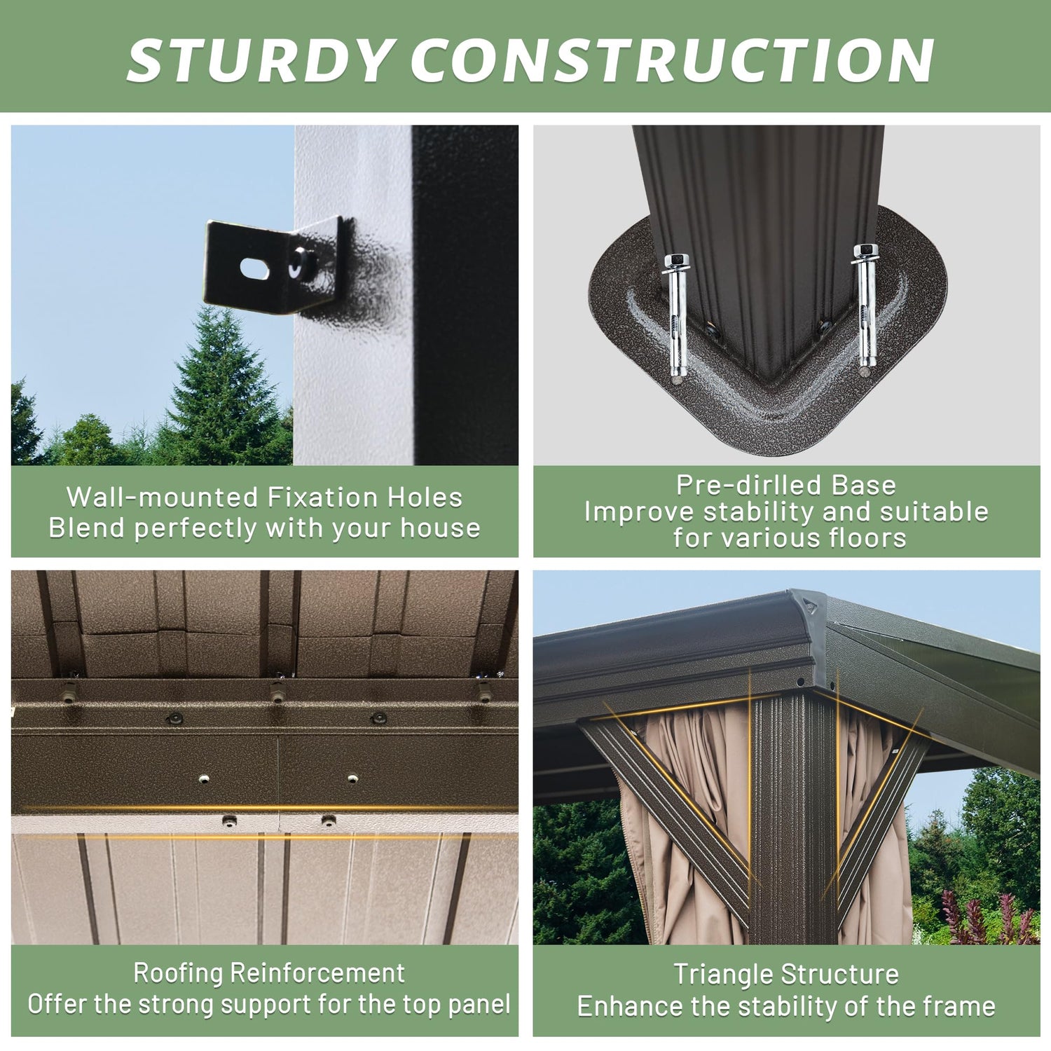 - Built for All-Weather Durability- Equipped with a robust galvanized sloped roof, domi 12’x14’ wall-mounted gazebo offers exceptional weight-bearing capacity, supporting up to 2500 lbs. Its innovative sloped roof design ensures efficient drainage of rain and snow, effectively preventing water buildup and potential damage during harsh weather conditions.