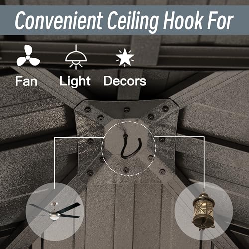 - 🏡❤️ Effortless Ambiance with Strong Hook - Enhance your hardtop gazebo's versatility with a robust hook! The hook effortlessly holds up to 20 lbs, allowing you to hang lights, fans, or decorations effortlessly. Create your perfect outdoor atmosphere with ease.