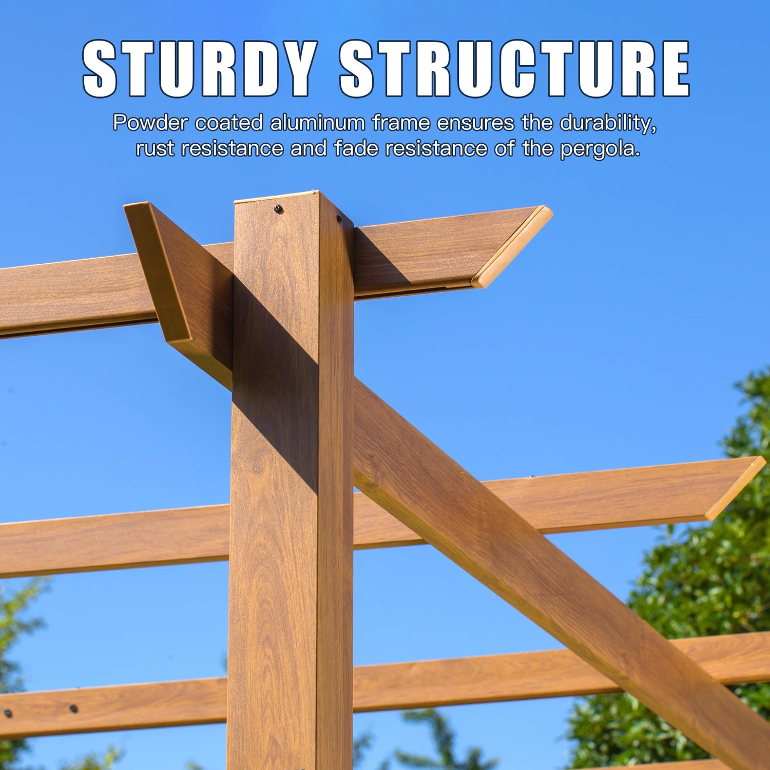 • 【Natural Wood Looking Finish】The pergola's aluminum frame is surfaced with the premium wood looking finish, making it look like real wood but without maintenance, and adding a beauty and delicacy to your backyard