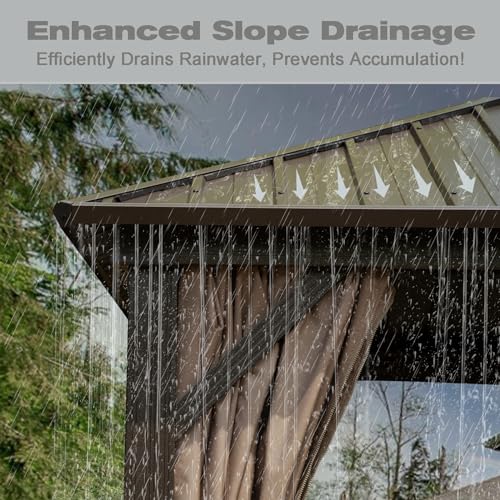 • [Classic Design] The domi backyard gazebo features a traditional and elegant appeal, as well as a sleek and minimalist appearance that will match the overall design and layout of your yard or patio. The area between the 2 roof levels allows air to circulate, resulting in a ventilation system that keeps the gazebo cool and pleasant on summer days. Furthermore, the slope of the roof allows rain and snow to flow down and off the structure, lowering the risk of damage and providing a resilient roof.