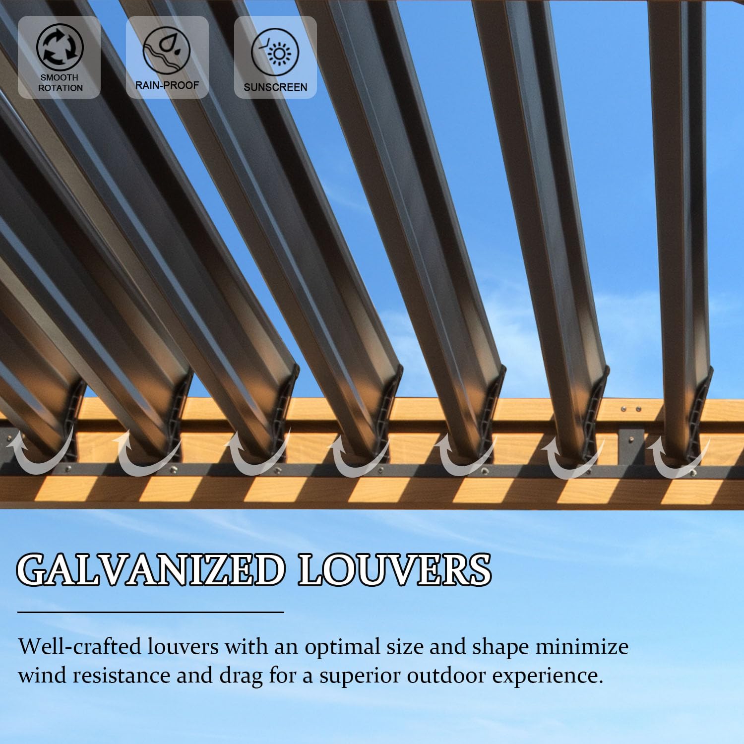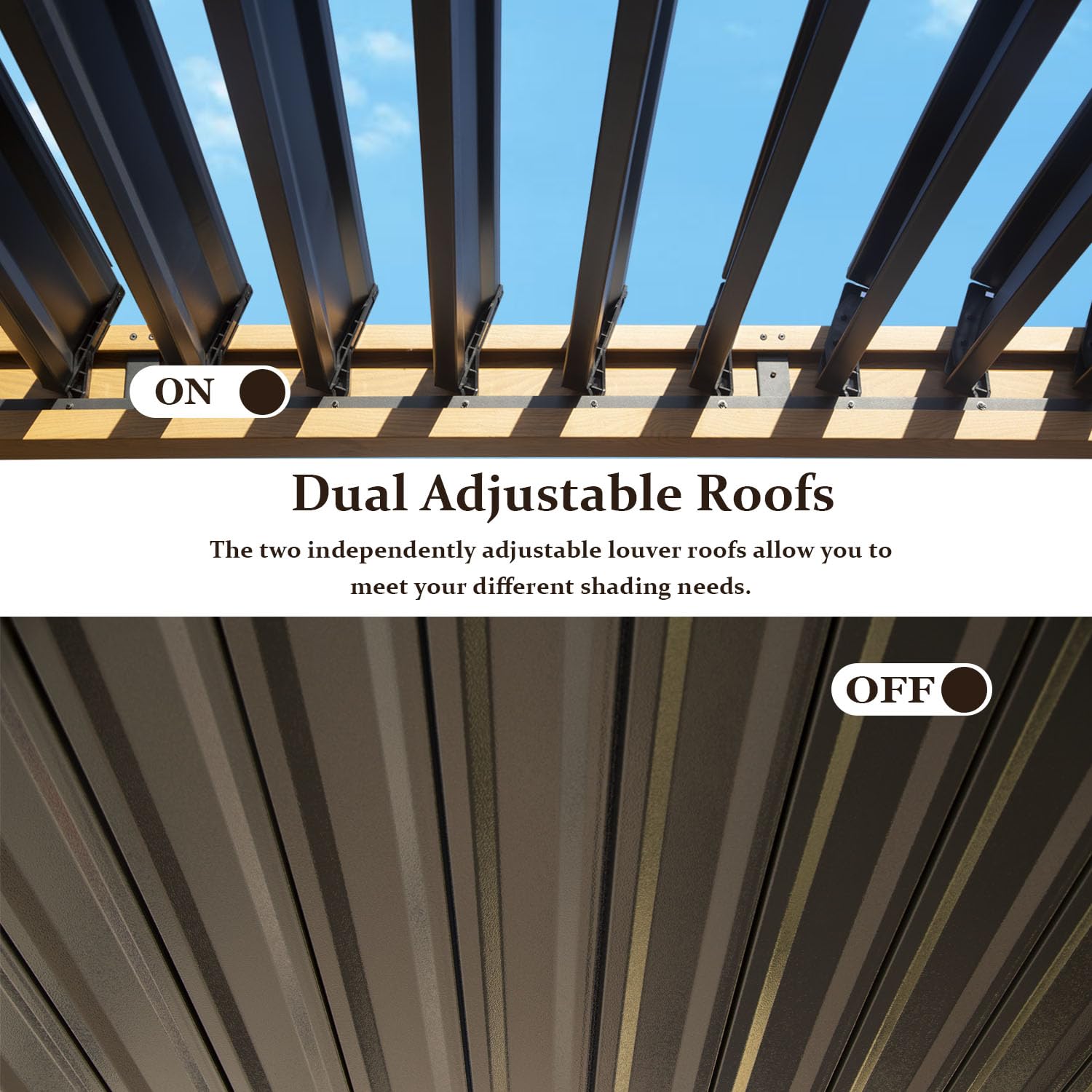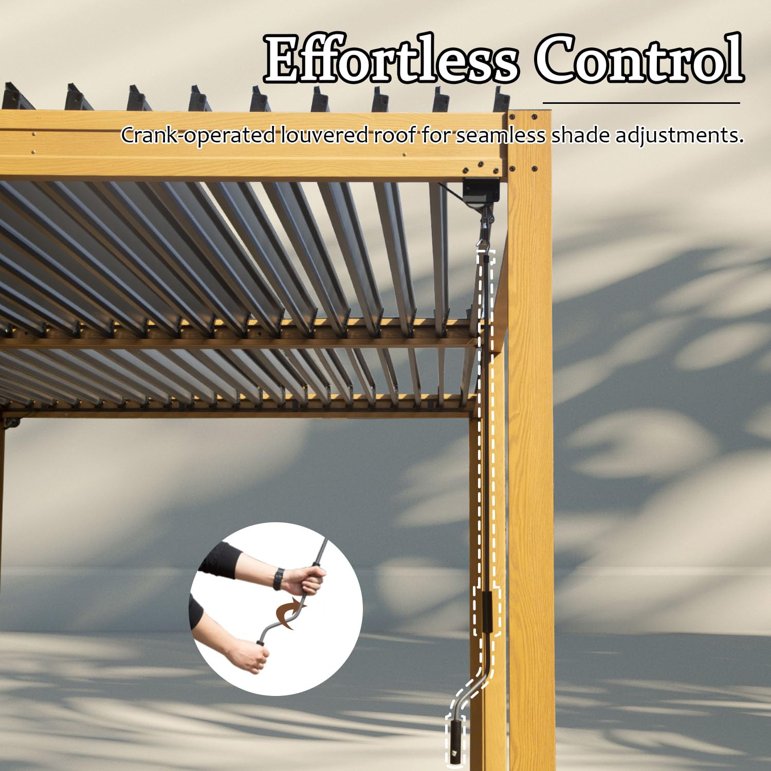 - [Adjustable Louvered Roof] Experience unparalleled versatility with the Domi aluminum pergola. Featuring an easy-to-use crank system, you can effortlessly adjust the louvers from 0° to 90° to control sunlight, ventilation, and shade. Whether you want a sunlit afternoon or a shaded retreat, this pergola meets all your needs.