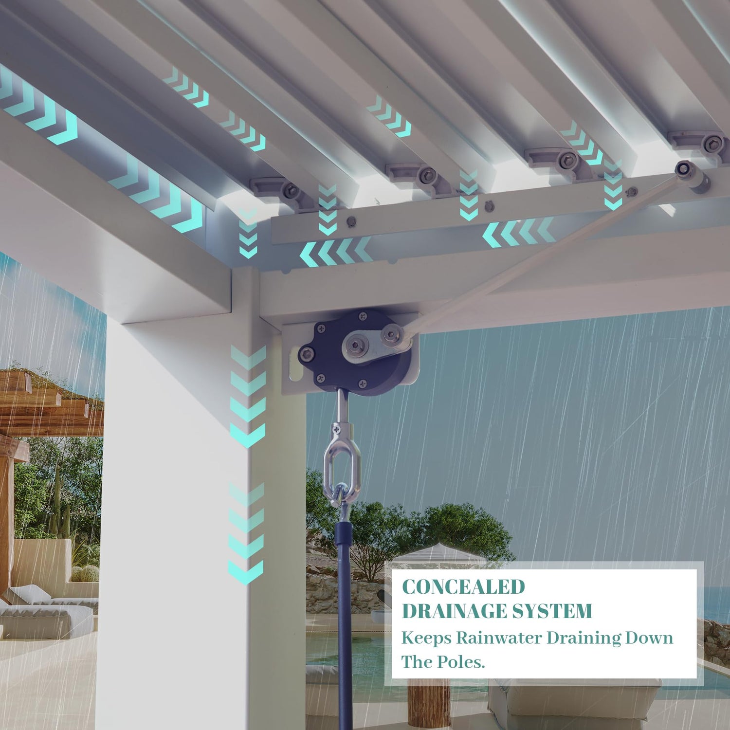 - 🏠Integrated Drainage System: This outdoor louvered pergola designed with a built-in gutter system along the roof to drain away water,avoiding water accumulation on the top.