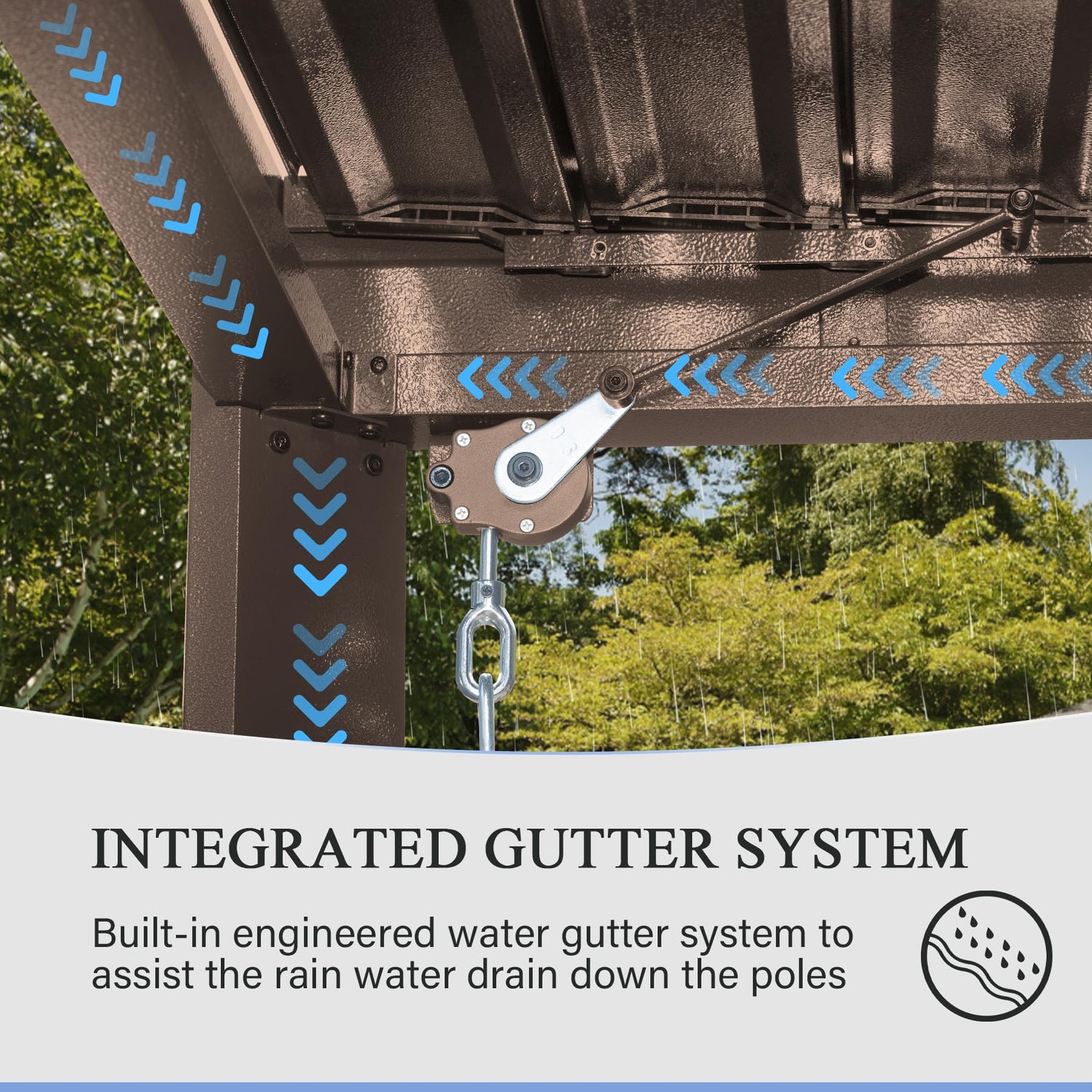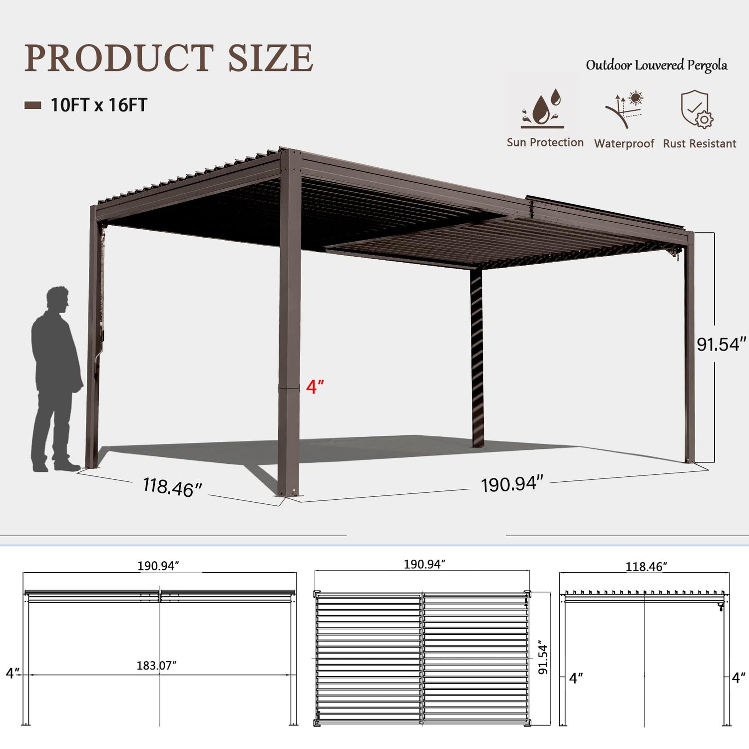 • Premium Aluminum Frame: This domi 10’x16’ pergola feature powder coated brown 4'' aluminum frame and galvanized steel louvered roof,treated to be deformation resistant and fade resistant,which could last years for outdoor use.Comes with pre-drilled base for each post,we suggest use expansion screws to make the whole system much more stable.