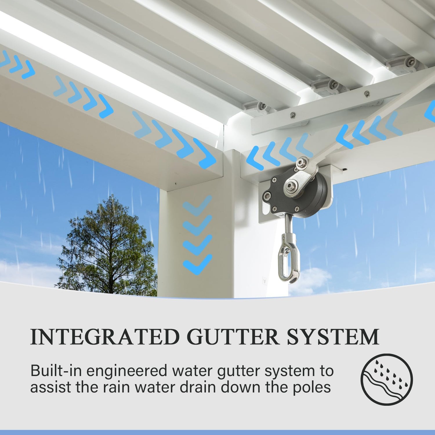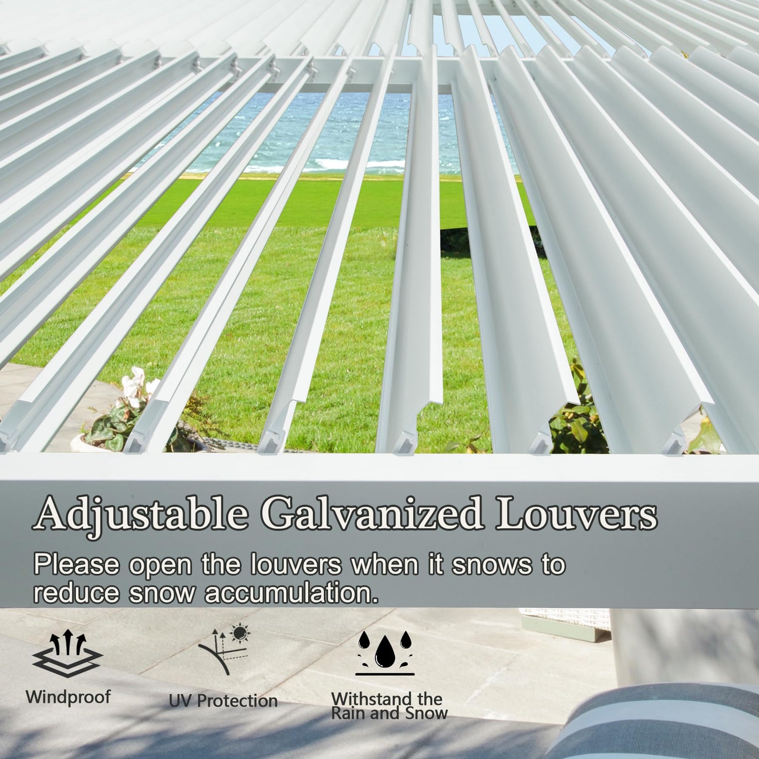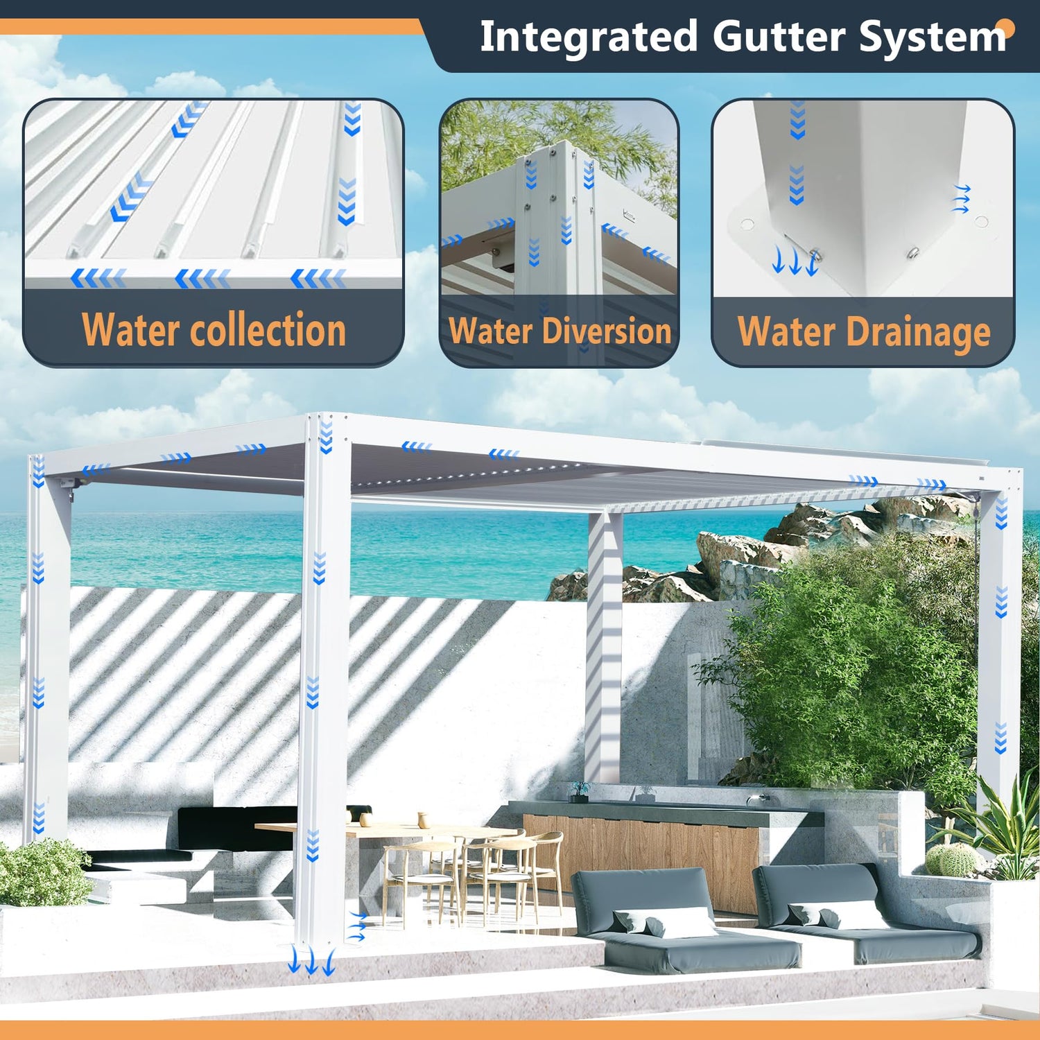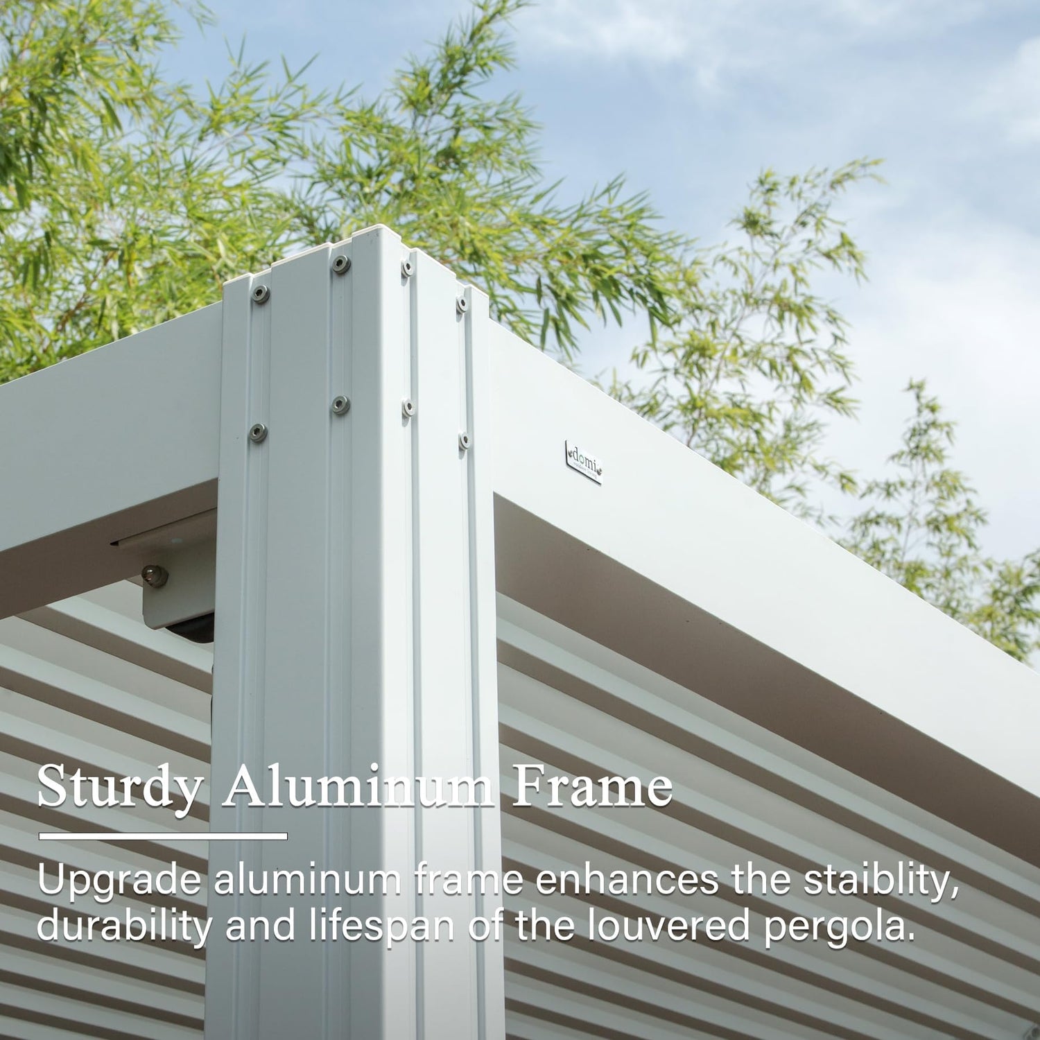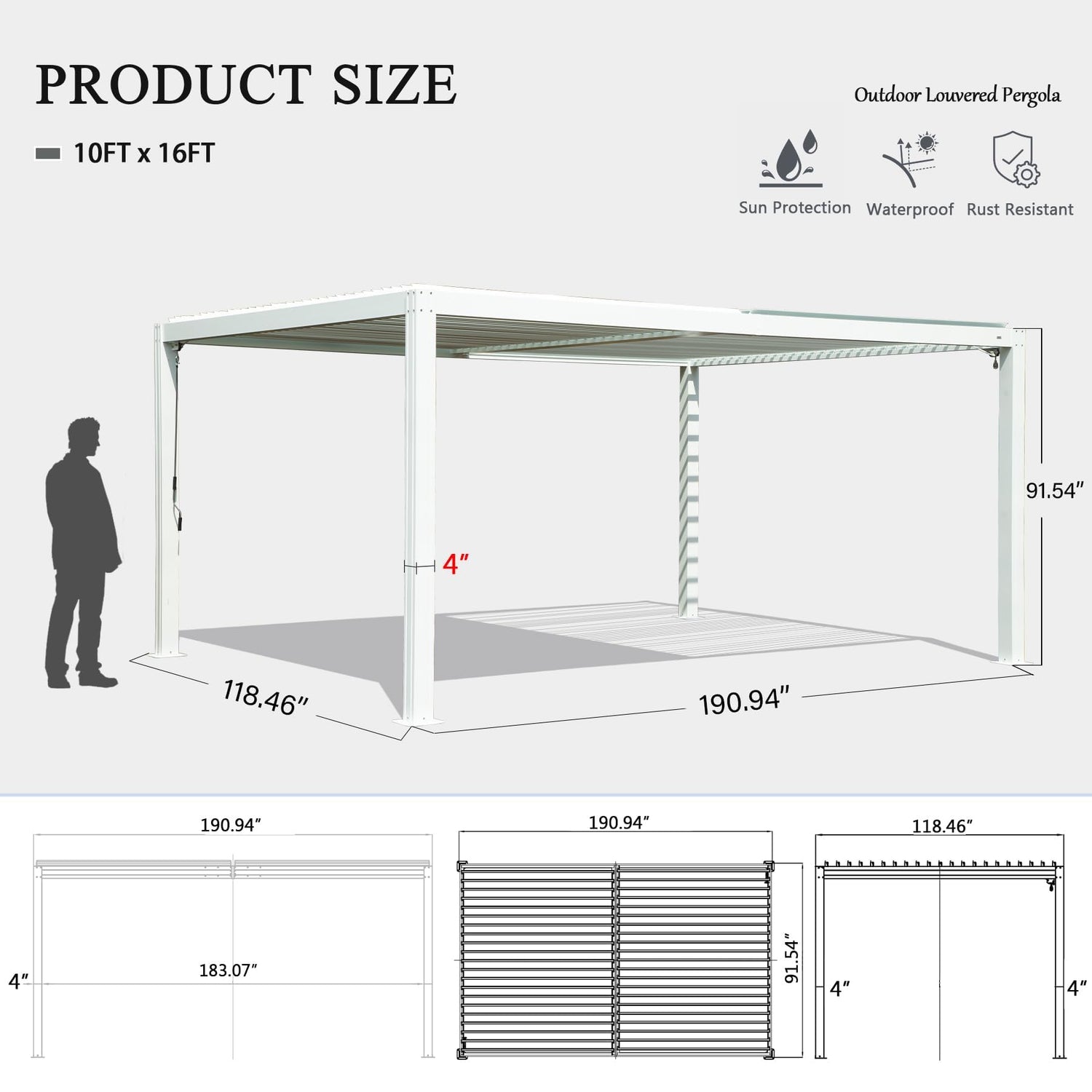 - Premium Aluminum Frame: This domi 10’x16’ pergola feature powder coated white 4'' aluminum frame and galvanized steel louvered roof,treated to be deformation resistant and fade resistant,which could last years for outdoor use.Comes with pre-drilled base for each post,we suggest use expansion screws to make the whole system much more stable.