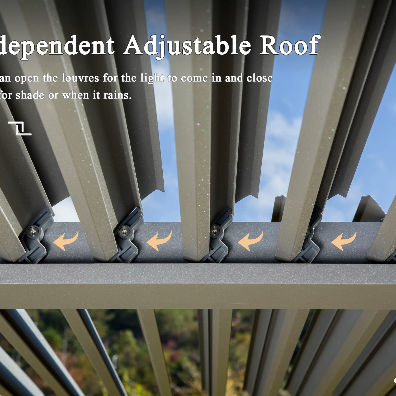 - Independent Adjustable Aluminum Roof: An update of traditional pergola which widens outdoor cover area and gives you every option sun, shade and stars. Size:12x16.