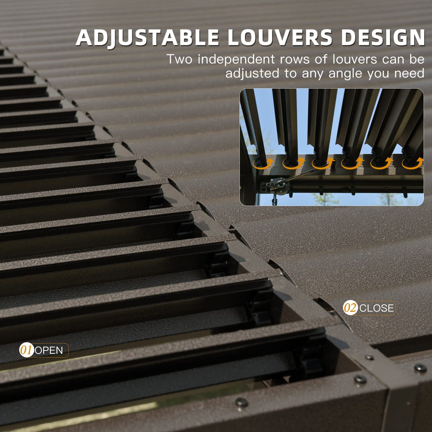 - 🌞Two Independent Adjustable Louvered Roof: Equipped with an easy-to-use crank system, this adjustable louvered pergola allows you to effortlessly adjust the louver angle from 0° to 90°. Take control of sunlight, ventilation, and shade according to your preferences.