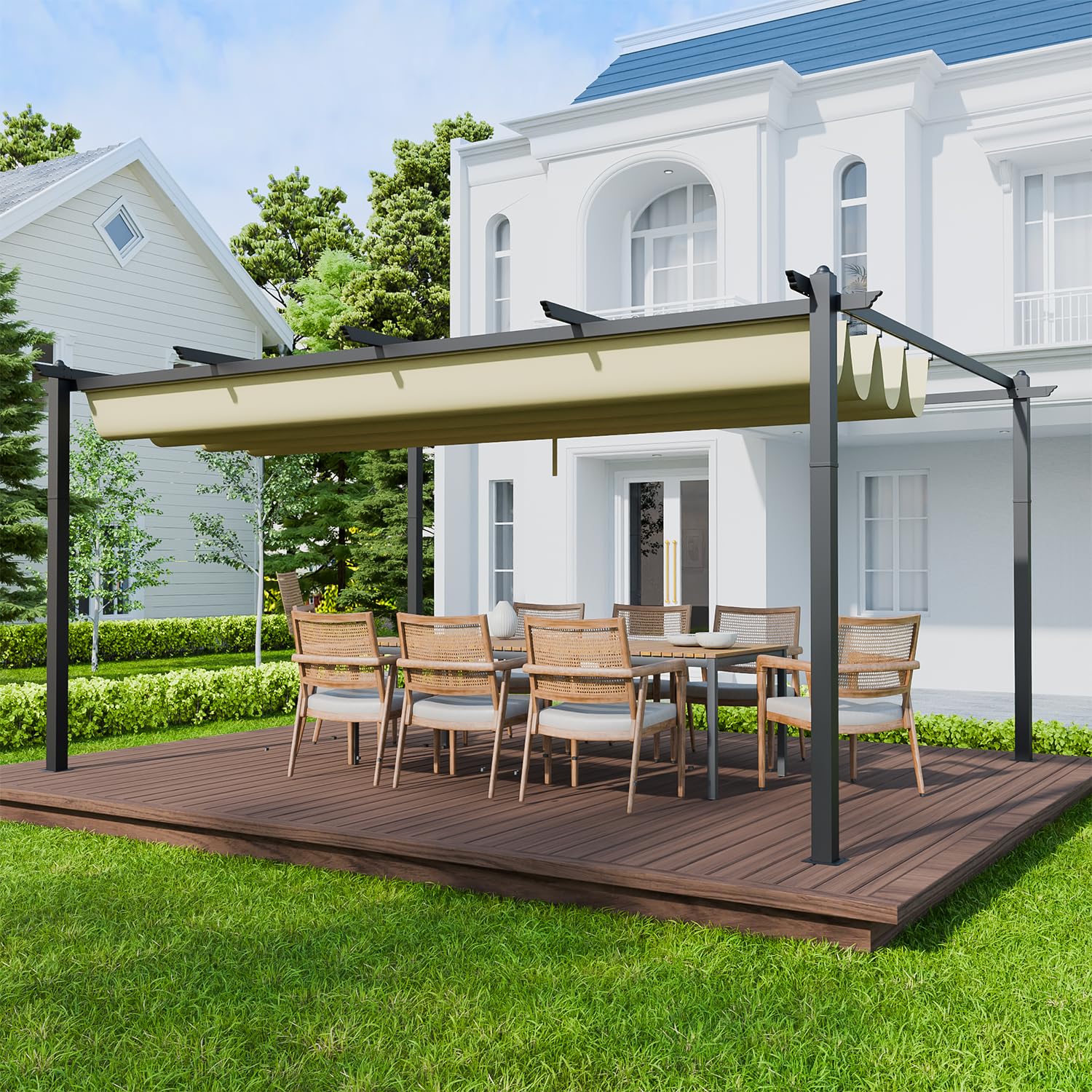 - 【VERSATILE AND SPACIOUS】This large-sized retractable pergola canopy provides plenty of space, it is perfect for hosting parties on a patio or other outdoor area, and it can also provide stable support for climbing plants. You can enjoy the scenic surroundings and relax under this pergola, which is definitely a perfect addition to your outdoor living.