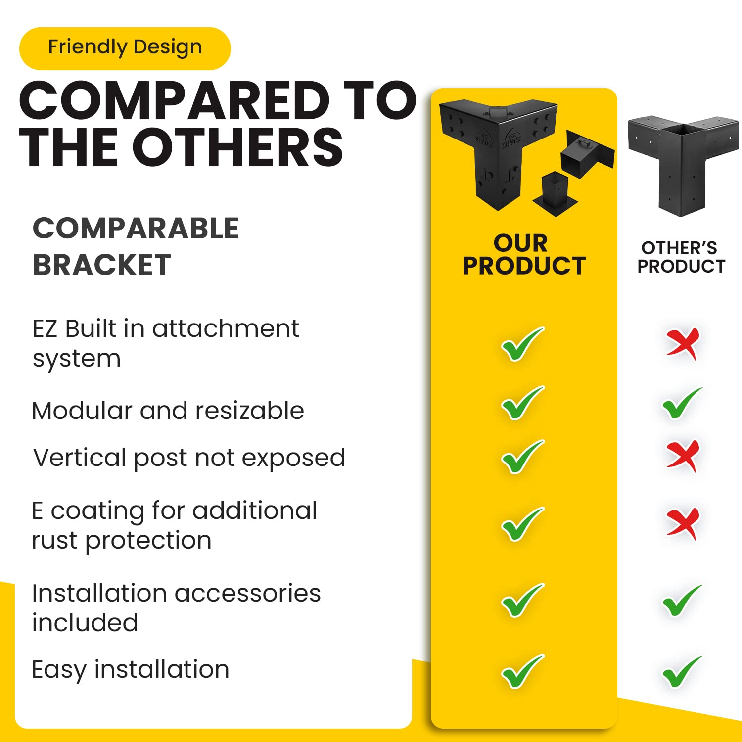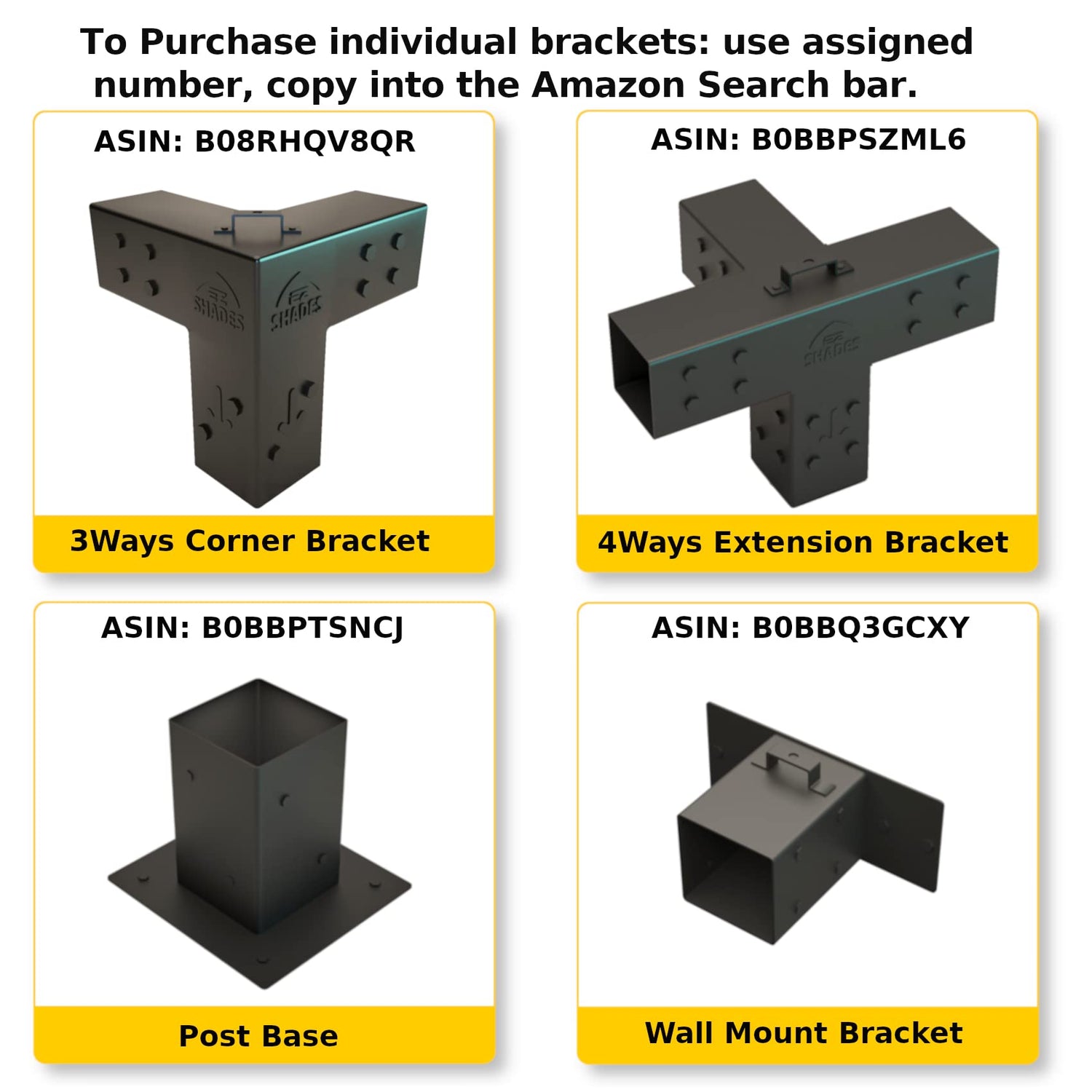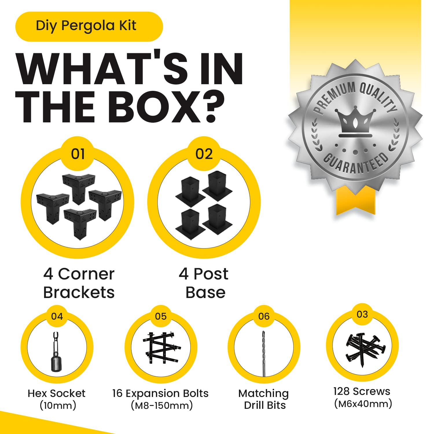 Details: Transform your outdoor space into a lovely alfresco living area by using a sturdy pergola, constructed with EZ Shades' free-standing Pergola Frame Kit . Specially made to fit 4x4 lumber (actual size 3.5x3.5 inches) for building secure and stylish pergolas for patios and backyards, our brackets help you erect safer structures conveniently. Dependable Solution: Pergola Hardware with Our 3-way corner brackets serve as a post to beam connector to ensure that each lumber post stays firmly in place. Their thickened steel and box design provide optimal security. Quick Installation: Unlike regular DIY brackets, we carefully crafted our pergola accessories with versatility and convenience in mind. Every purchase comes with an installation manual. You can also browse our online tutorial. What’s Included: 4 3-Way Corner Brackets 4 Post Bases 128 Screws: M6 x 40 mm 16 Expansion Bolts: M8-150 mm Matching Drill Bits (for wood and masonry) 10 mm Hex Socket Important Note: The pergola shade and lumber posts are not included in the package. Made by DIYers for DIYers We started our company by making our own pergola and realized it wasn’t easy. This led us to create our quality DIY pergola kits and accessories. Our products are easy to assemble, cost-effective and designed in sunny San Diego, California. So, we know they work!Build pergolas conveniently with EZ Shades’ Pergola Bracket Kit!