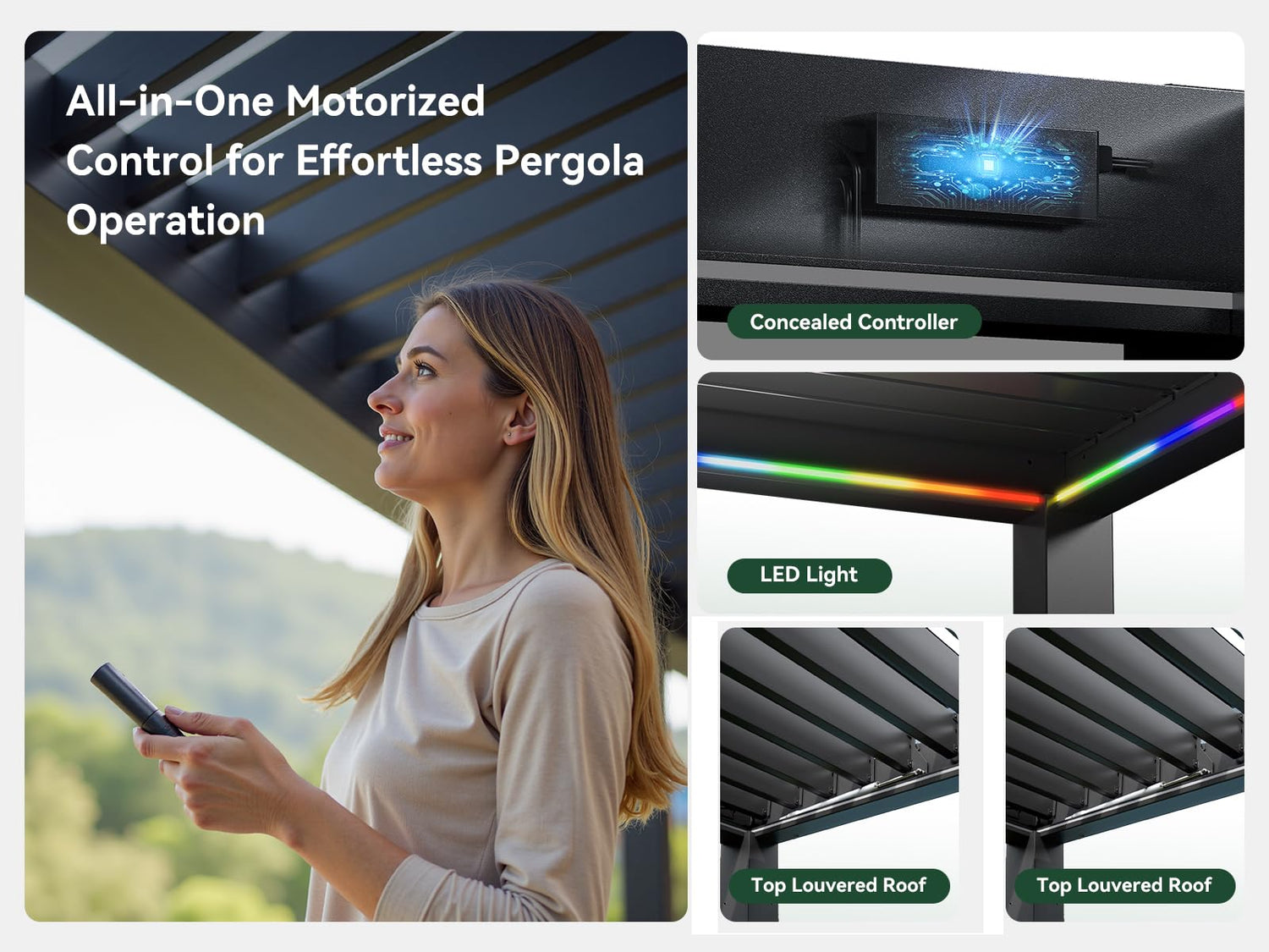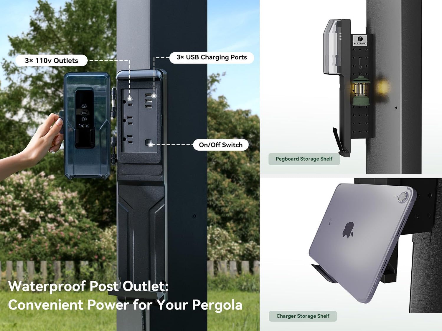 - -Customized Outdoor Pergola Kits:The FlexPatio Pergola Kit includes: a power outlet integrated into the post, ambient LED lighting, a motorized top louvered roof, and a GFCI smart safety plug. Customize your outdoor pergola by adding sliding glass doors, motorized roller shutters, and privacy shutter walls—build the perfect pergola that’s uniquely yours.