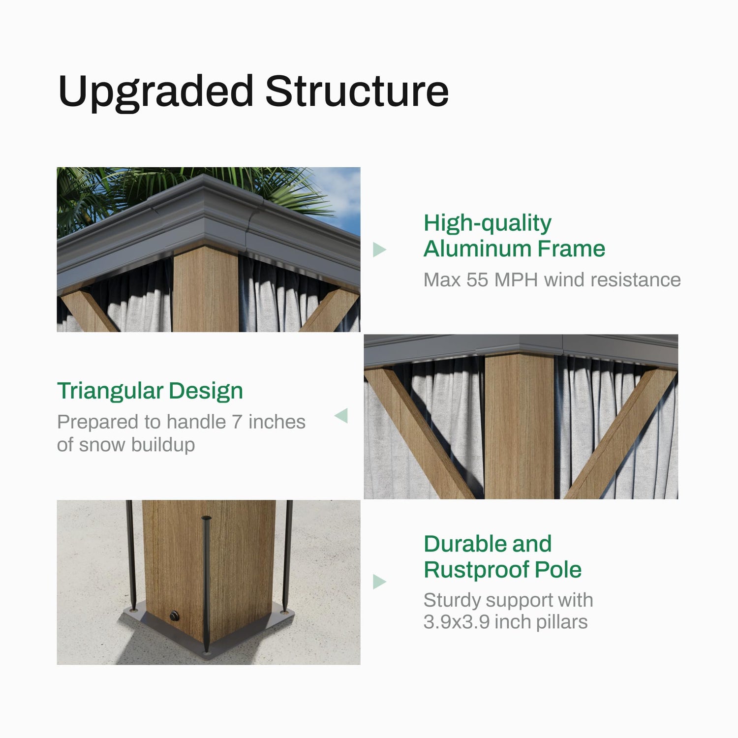 • 【MESH CURTAINS&PRIVACY CURTAINS】- The hardtop gazebo features a dual-track system that allows for effortless sliding. It includes removable curtains for UV and rain protection, along with a mesh curtain equipped with a zipper to ensure excellent ventilation and keep mosquitoes out. This setup provides both privacy and a wide outdoor view, allowing you to enjoy the outdoors comfortably.