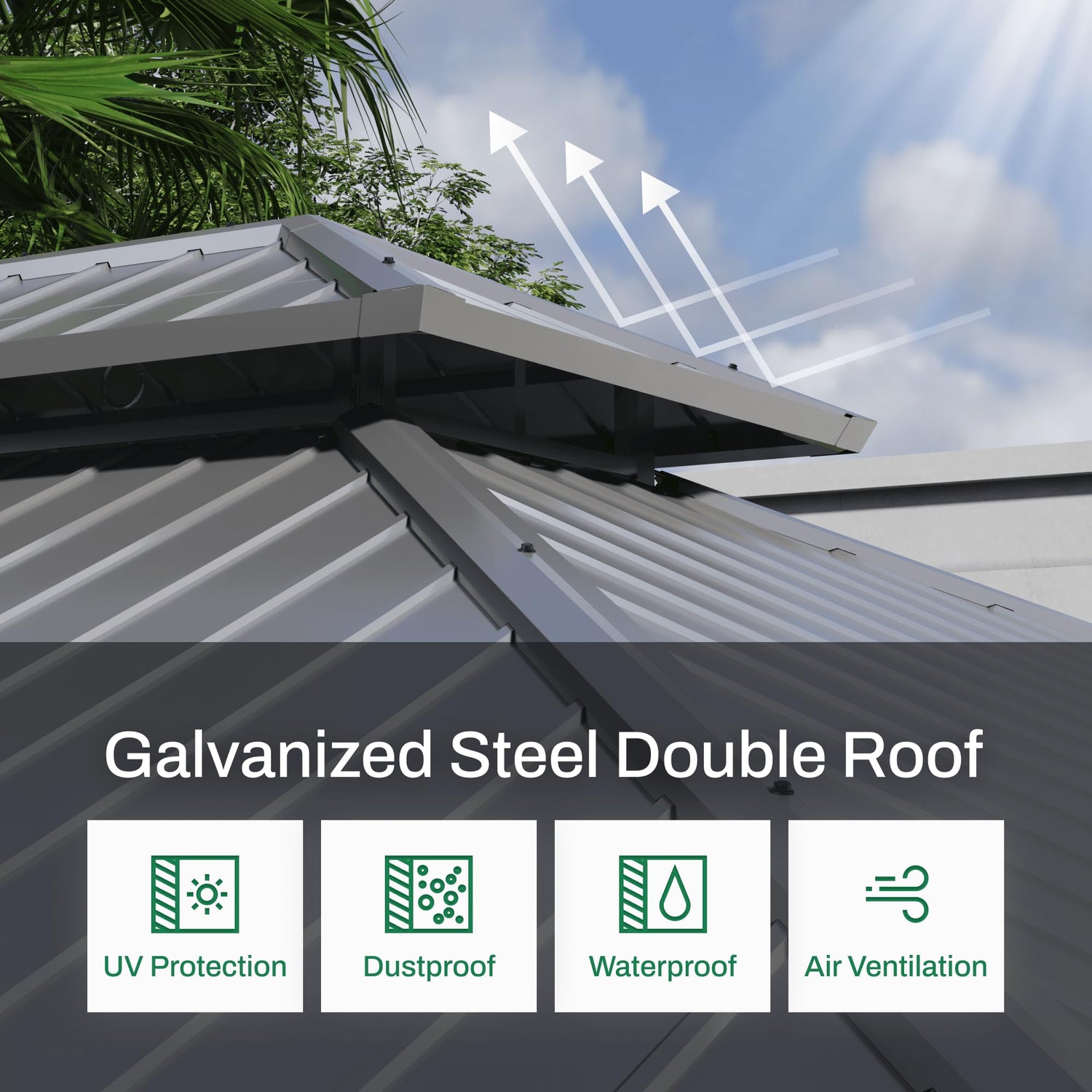 • 【GALVANIZED STEEL DOUBLE ROOF】- Florise patio gazebo features a dual-layer roof design that prevents harmful UV rays, promotes better airflow, and enhances ventilation within the gazebo. This combination helps prevent heat buildup, making the gazebo more comfortable during hot summer days while also aiding in withstanding wind.