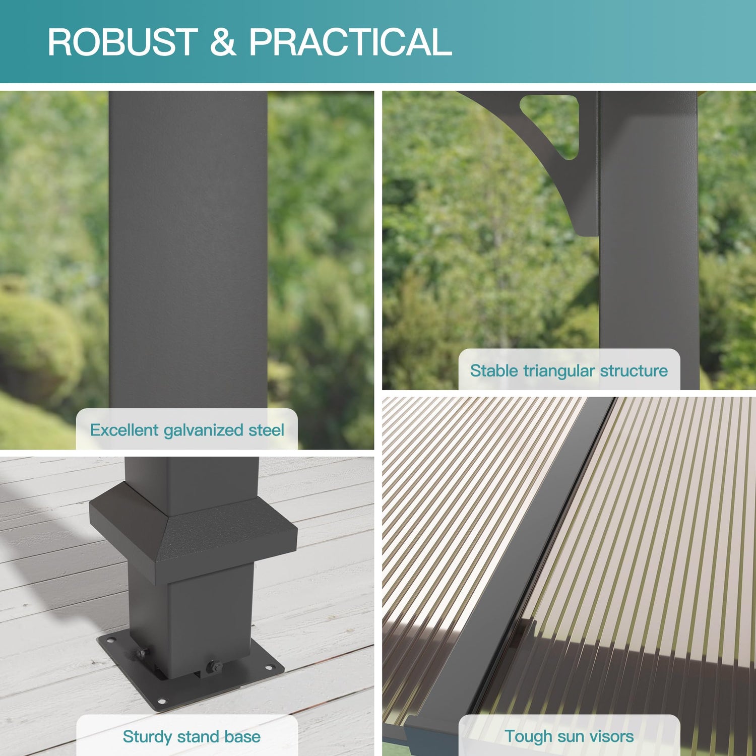 • 【CONVENIENT ASSEMBLY】:We have detailed installation instructions, to assemble the pergola we recommend 3-5 people work together to finish the job, which will take you about 2-5 hours. The top visor weighs one-fifteenth the weight of glass of the same thickness and has 16 times the impact strength of glass. Easy to assemble and safe to use.We also provide excellent after-sales service, you can contact us anytime if you have any questions, we will reply and solve the problems for you.