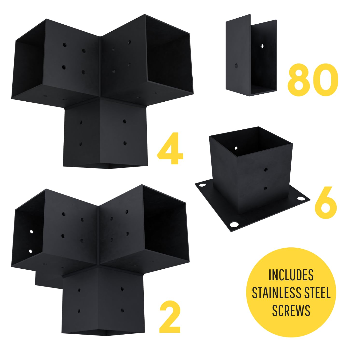 - Stand-alone pergola kit includes: 6 post base brackets, 4 corner brackets and 2 middle 4-arm brackets (all for 4x4 wood posts) + 80 insert brackets (for 2x4 wood slats) + stainless steel screws