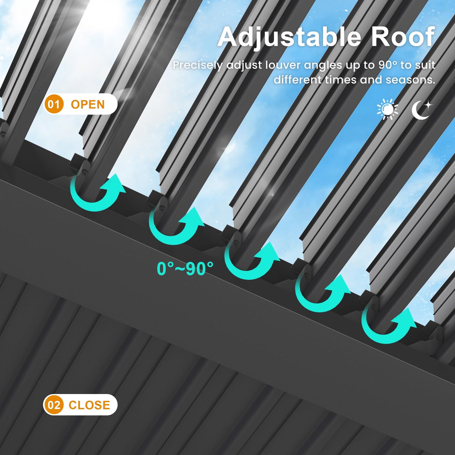 • 【Versatile Adjustable Roofs】- Featuring two independently adjustable metal roofs, our pergola allows you to easily control the amount of sunlight and shade over an area of up to 192 square feet. Adjust the roof from 0°to 90° to enjoy the perfect balance of sun and shelter, suitable for all your outdoor gatherings, be it parties, BBQs, or quiet family time.