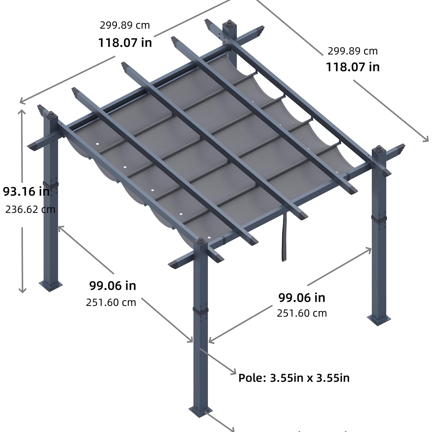 • 【Size Information】: The external dimensions of this pergola are 9.8'x9.8'x7.8', and the internal usable dimensions are 8.3'x8.3'x7.3'.Please measure your installation space before purchasing.