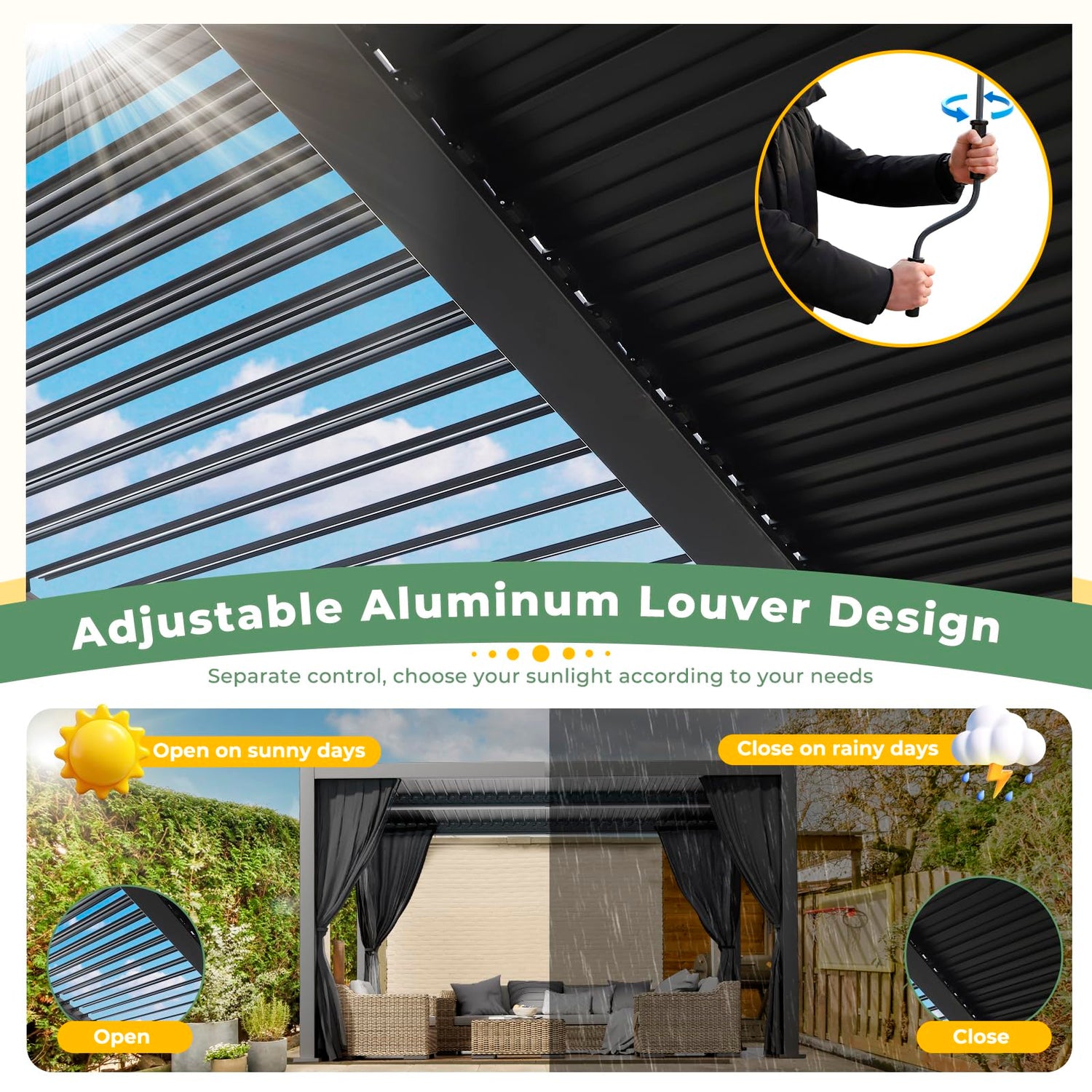 • 【Adjustable Roof】: Experience unparalleled flexibility with our aluminum pergola's adjustable roof. Capable of tilting smoothly from 0°to 90°, it empowers you to precisely manage the amount of sunlight and shade in your outdoor haven. Whether you want to enjoy full sun or cool shade, this pergola will effortlessly fulfill your needs.