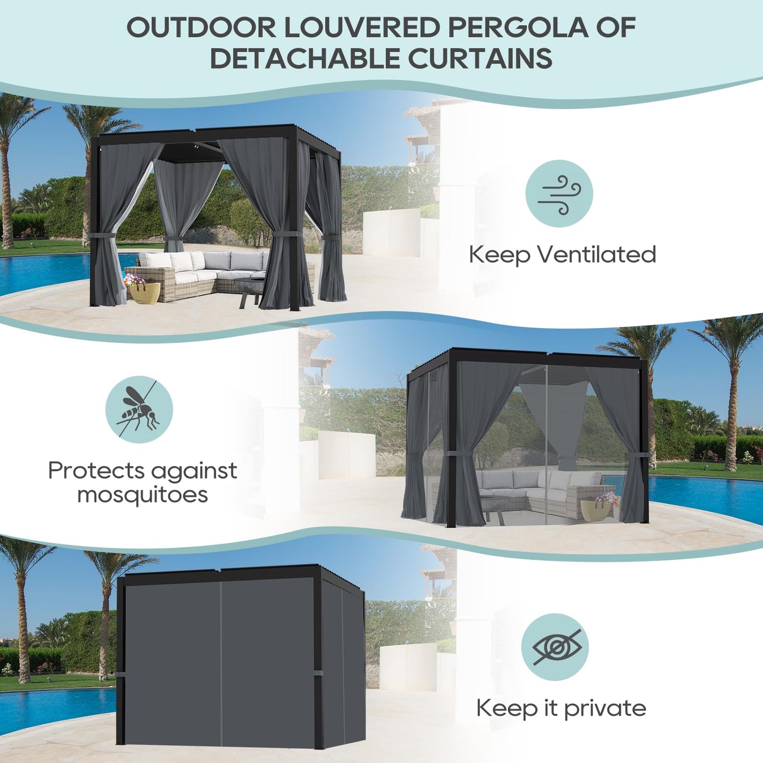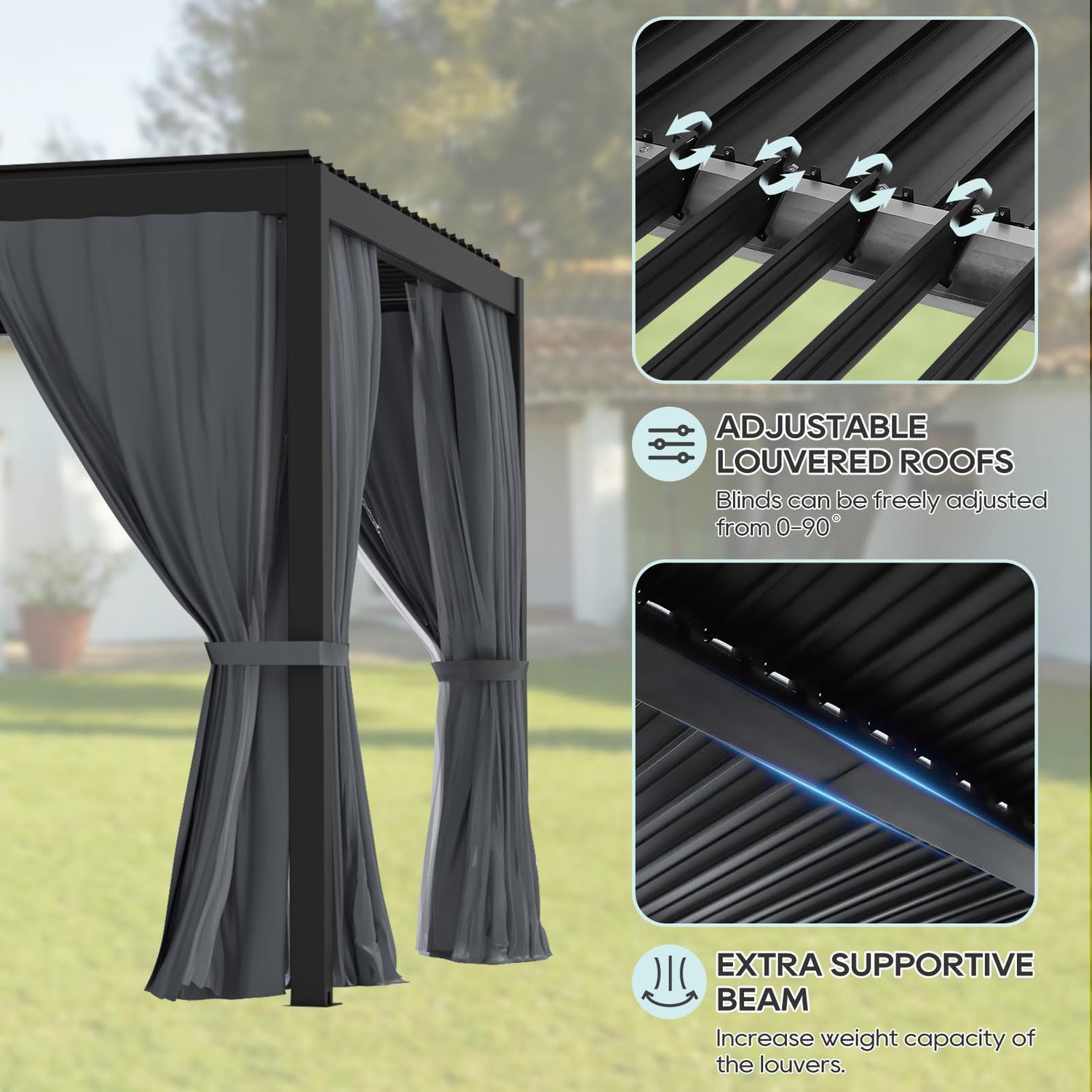 • Adjustable Roof: Equipped with two independently controlled louvered roofs, our aluminum outdoor pergola offers effortless angle adjustment to control sunlight and shade. When fully closed, it provides excellent shelter from rain