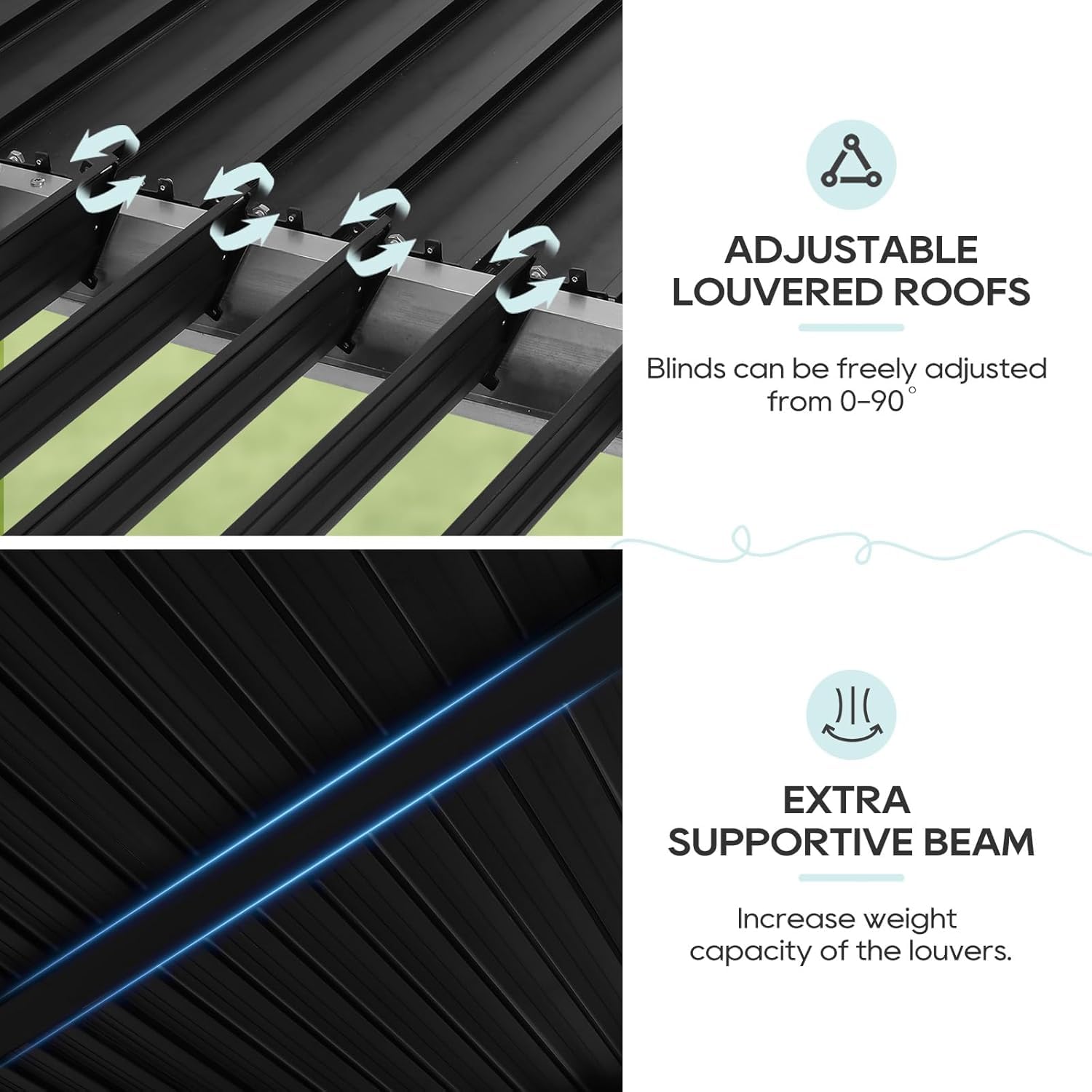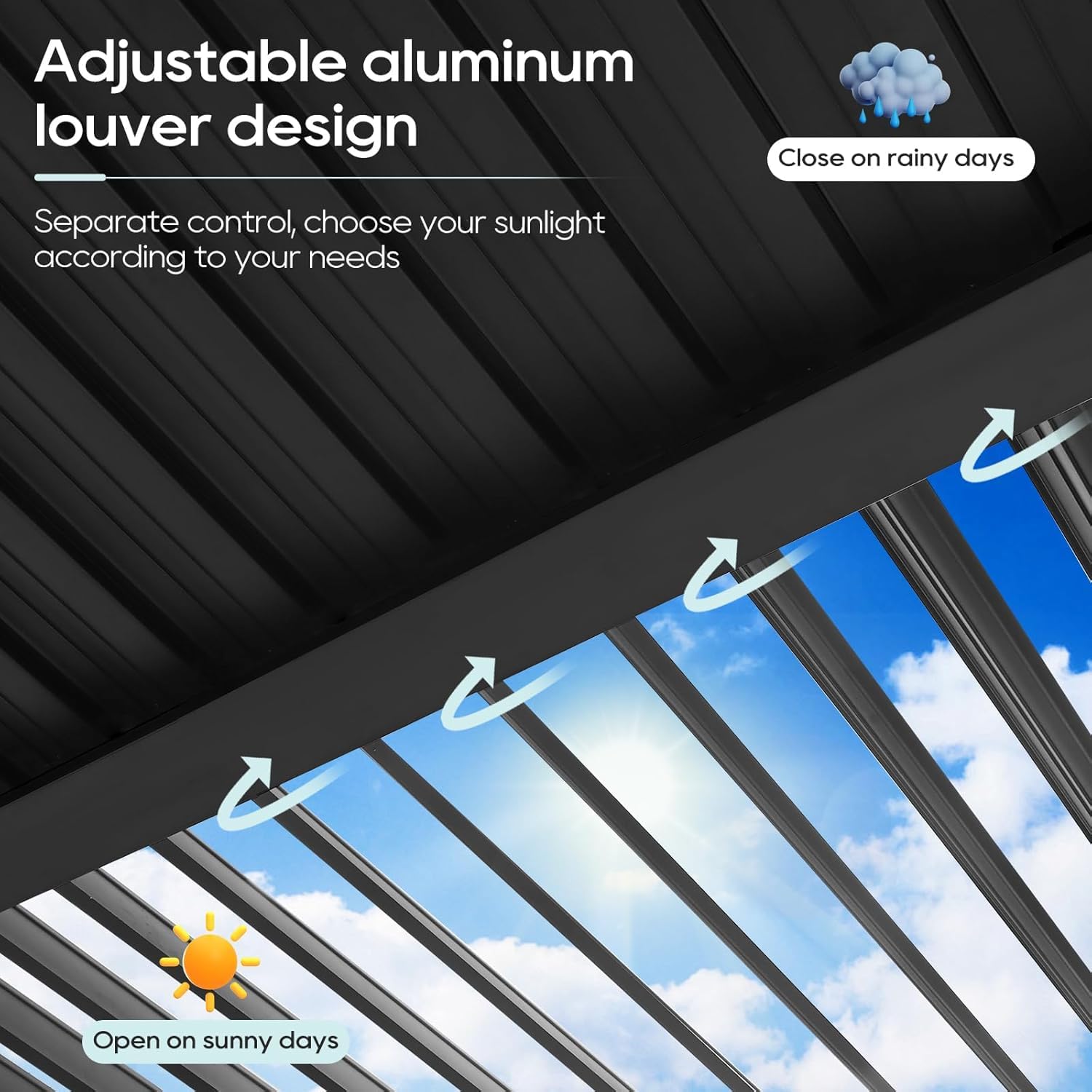 - 【Adjustable Louvered Roof】Enjoy ultimate control over sunlight and shade with our outdoor pergola's independent adjustable louvers, ranging from 0° to 90° effortlessly. This feature not only provides shade but also shelters you from rain when fully closed, ensuring year-round comfort.