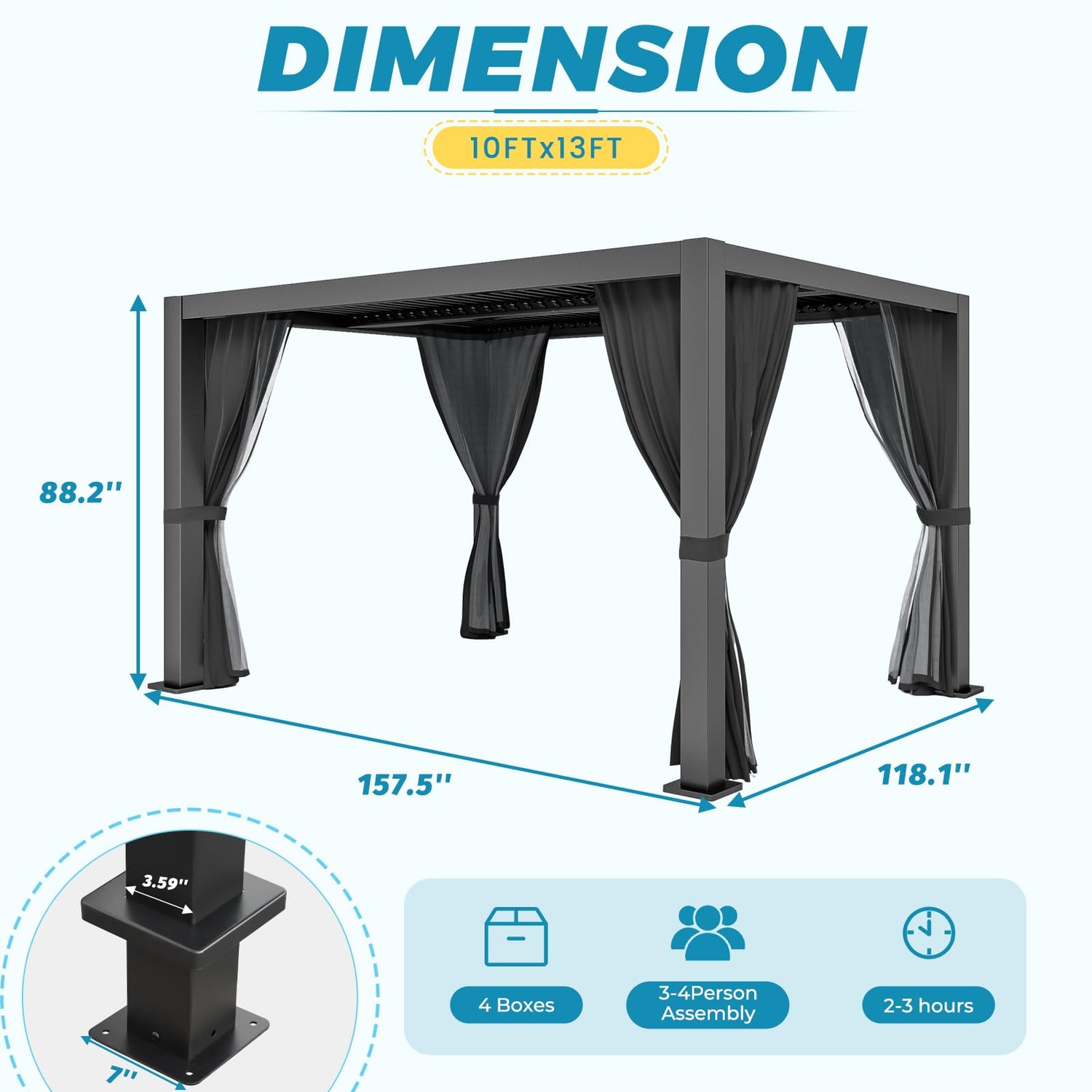 LVUYOYO Outdoor Louvered Pergola 10' x 13', Aluminum Pergola with Adjustable Roof, Waterproof Metal Gazebo with Curtains and Netting for Patio, Backyard, Garden, Deck (Black)