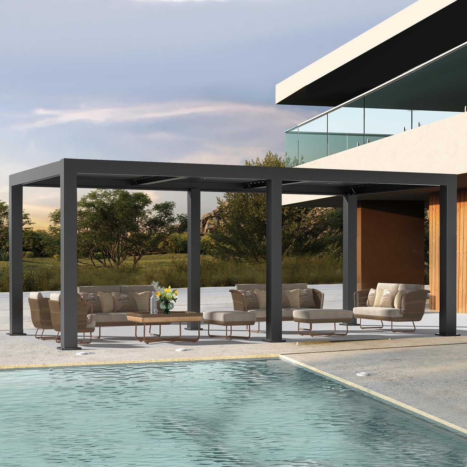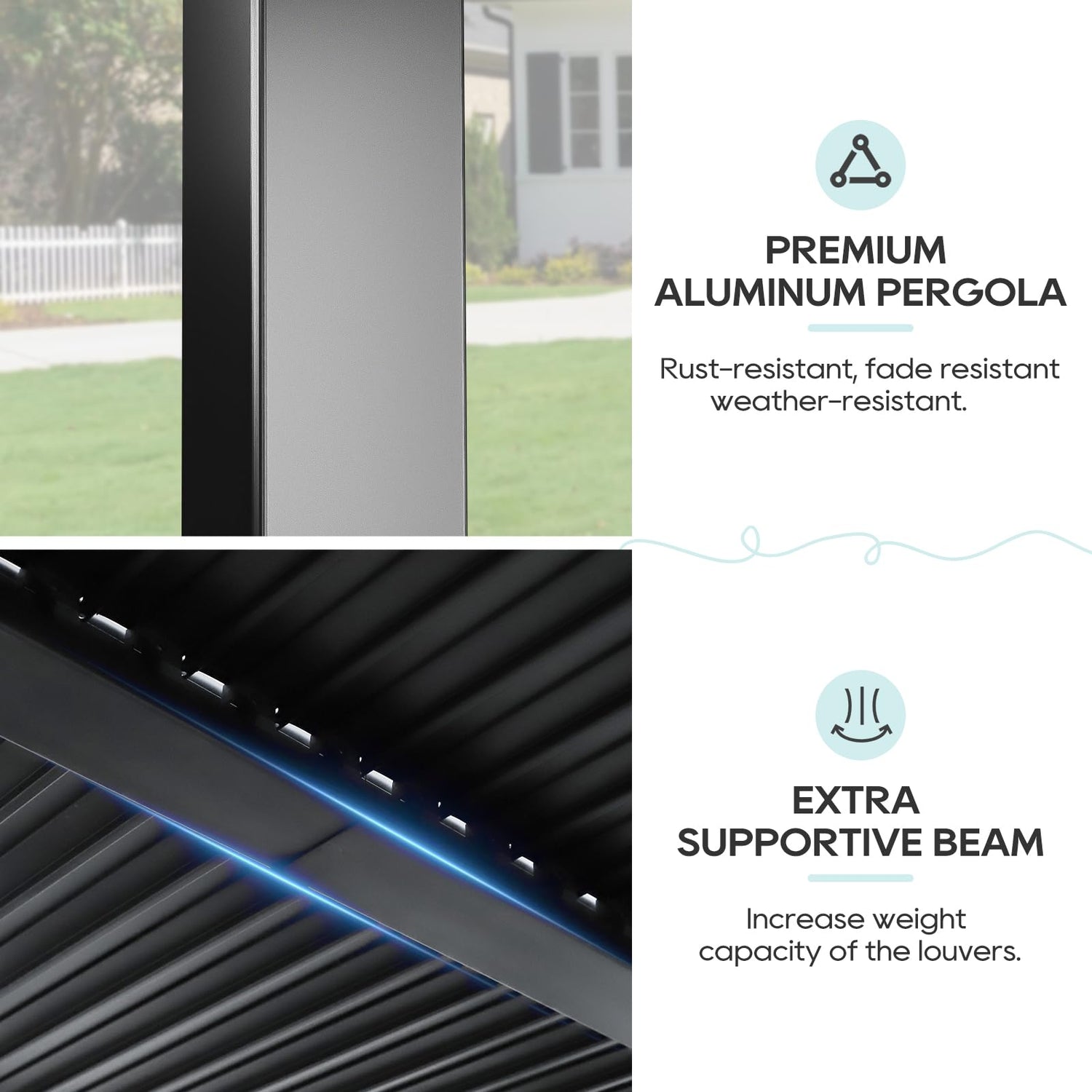 • 【Aluminum Pergola】Crafted from powder-coated aluminum, our louvered pergola offers durability, rust-resistance, and long-term outdoor use. Its modern design adds sophistication to your outdoor space, whether it's your deck, patio, poolside, or garden