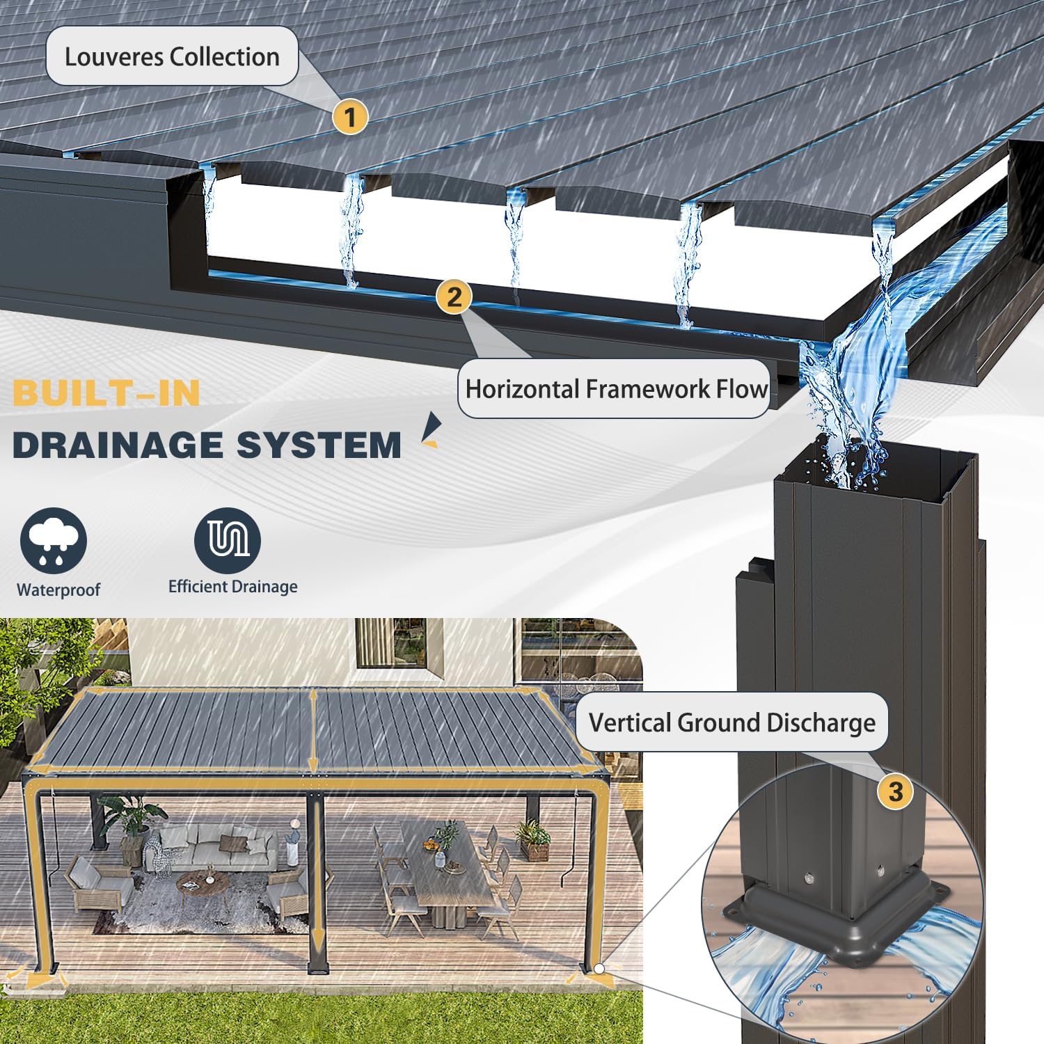 - BUILT-IN DRAINAGE SYSTEM: Easily weatherproof your space by closing the louvered roof in changing weather. Rainwater on the louvres flows into guttering channels, draining through the legs to the ground. This drainage system prevents water drips on furniture, ensuring comfort and facilitating maintenance.