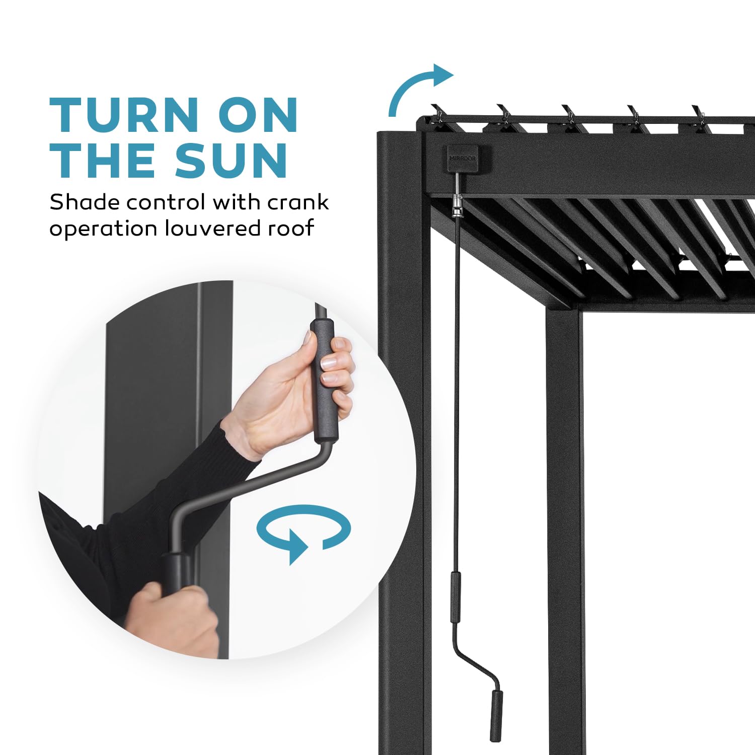 - Adjustable Louvered Roof: The Mirador 111S Round pergola features a unique louvered hardtop design that lets you modify the light angle from 0° to 90°, providing a variety of protection options against the sun, rain, and wind.