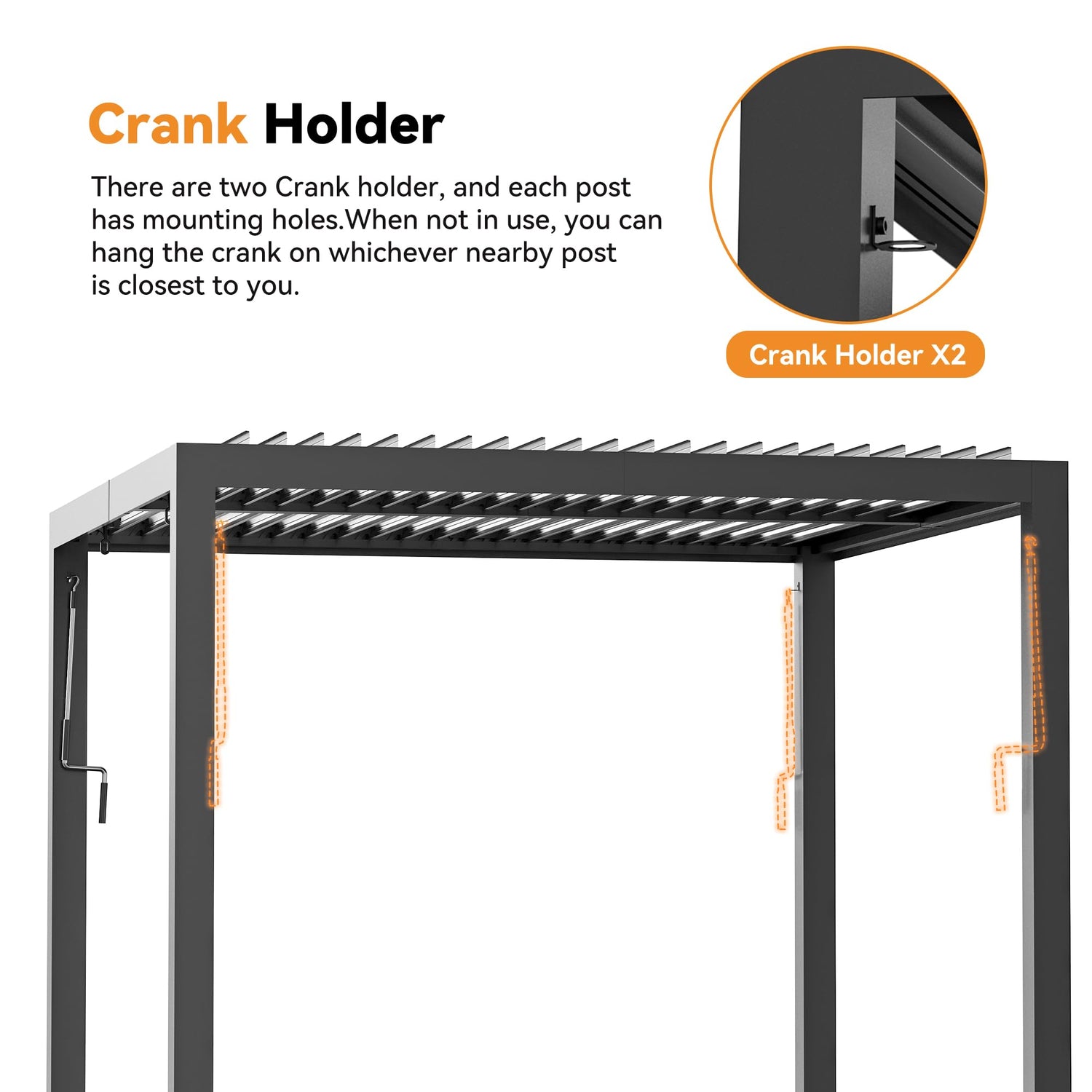 - [Precision Adjustable Louvers] Effortlessly control sunlight, shade, and airflow. Simply adjust the angle (0°-85°) of your louvered pergola roof by two crank holder. Create the perfect ambiance for relaxing, dining, or entertaining anytime. There are two Crank holder, and each post has mounting holes.When not in use, you can hang the crank on whichever nearby post is closest to you.