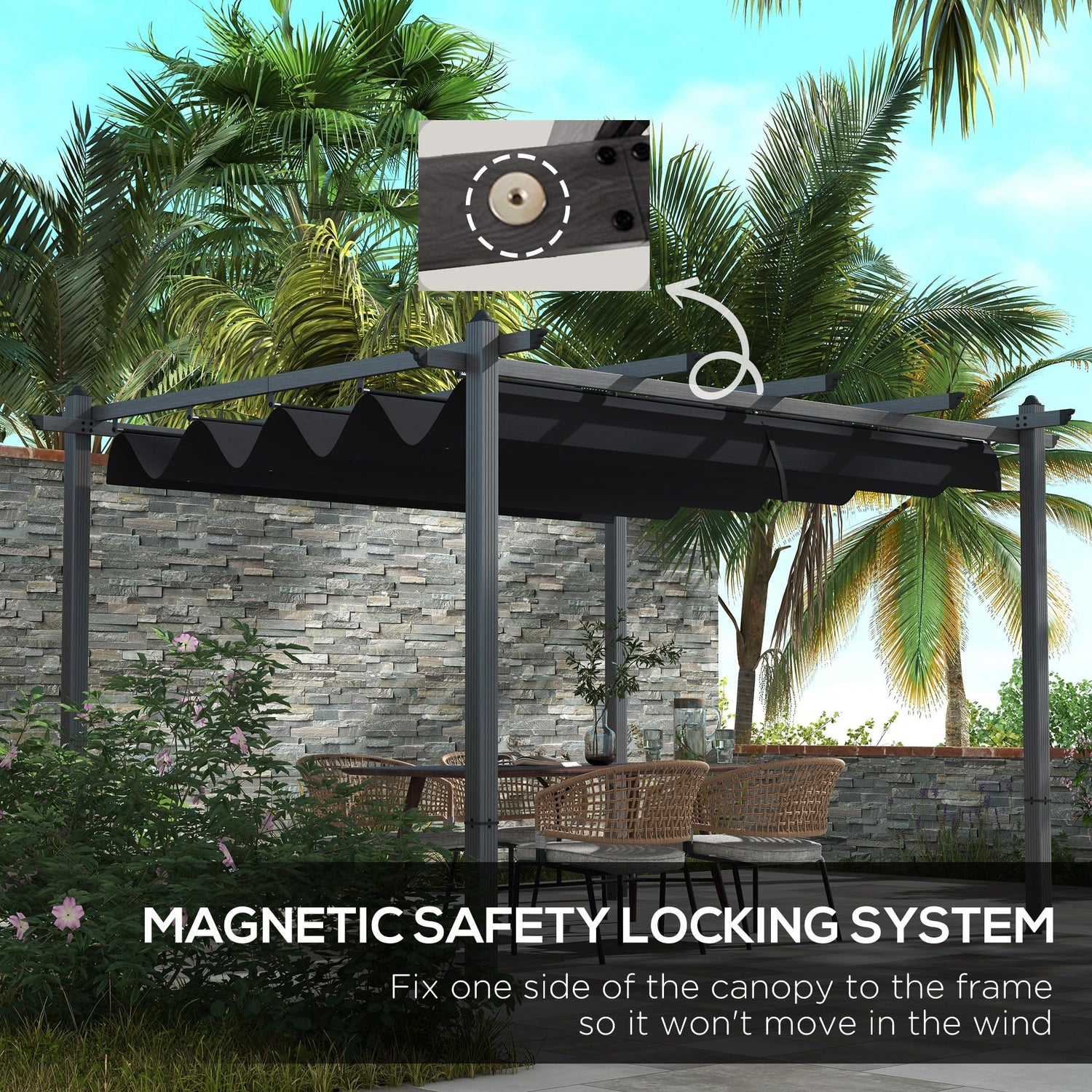 • Retractable Pergola Canopy: Our outdoor pergola comes with its own retractable shade cover, with a small top canopy providing extra protection for the larger canopy. A side has magnetic safety locking system prevents the canopy from blowing around in the wind.