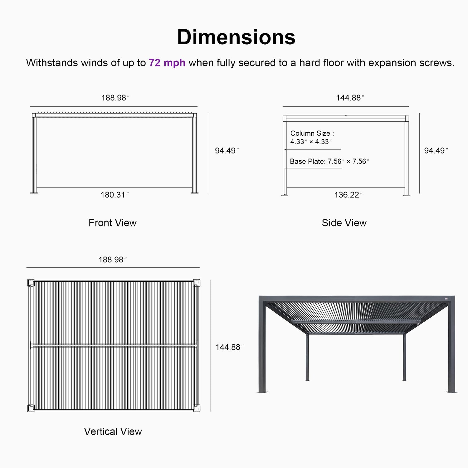 - Premium Material & Construction: This louvered pergola is made of a powder-coated aluminum frame which resists scratching, peeling, corrosion and rusting that will last for years of use. Can withstand wind speeds of up to 72 mph when fully secured by expansion screws on hardened floors.