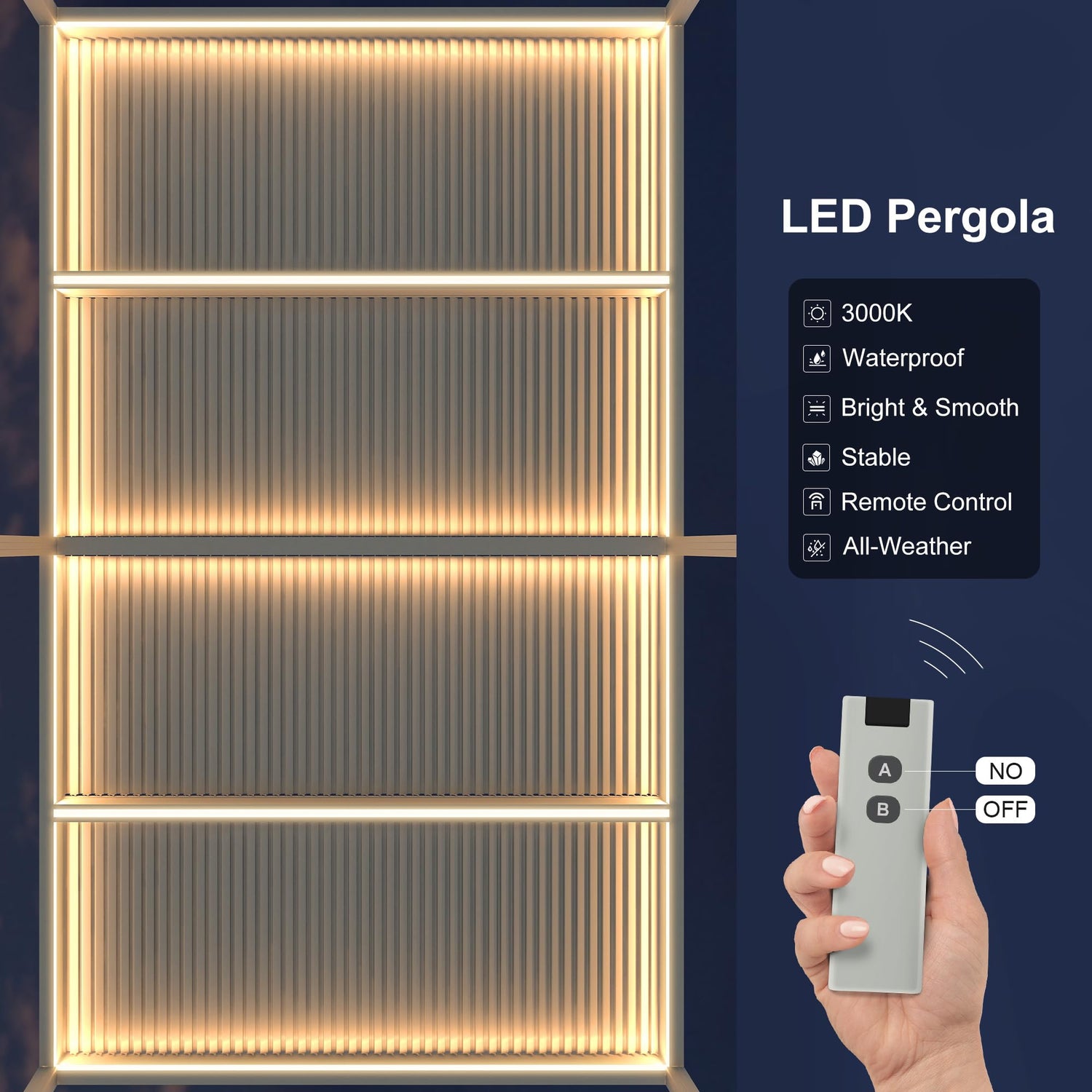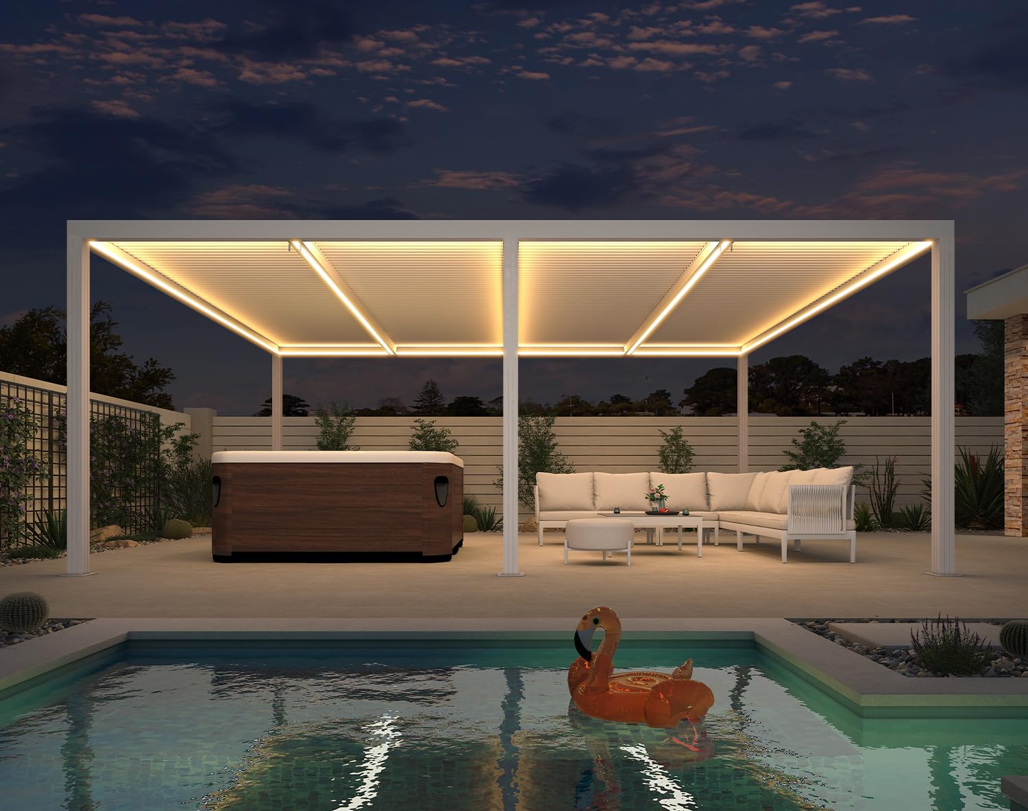 - This 12' × 20' louvered pergola with a warm 3000K glow and a remote control for easy operation