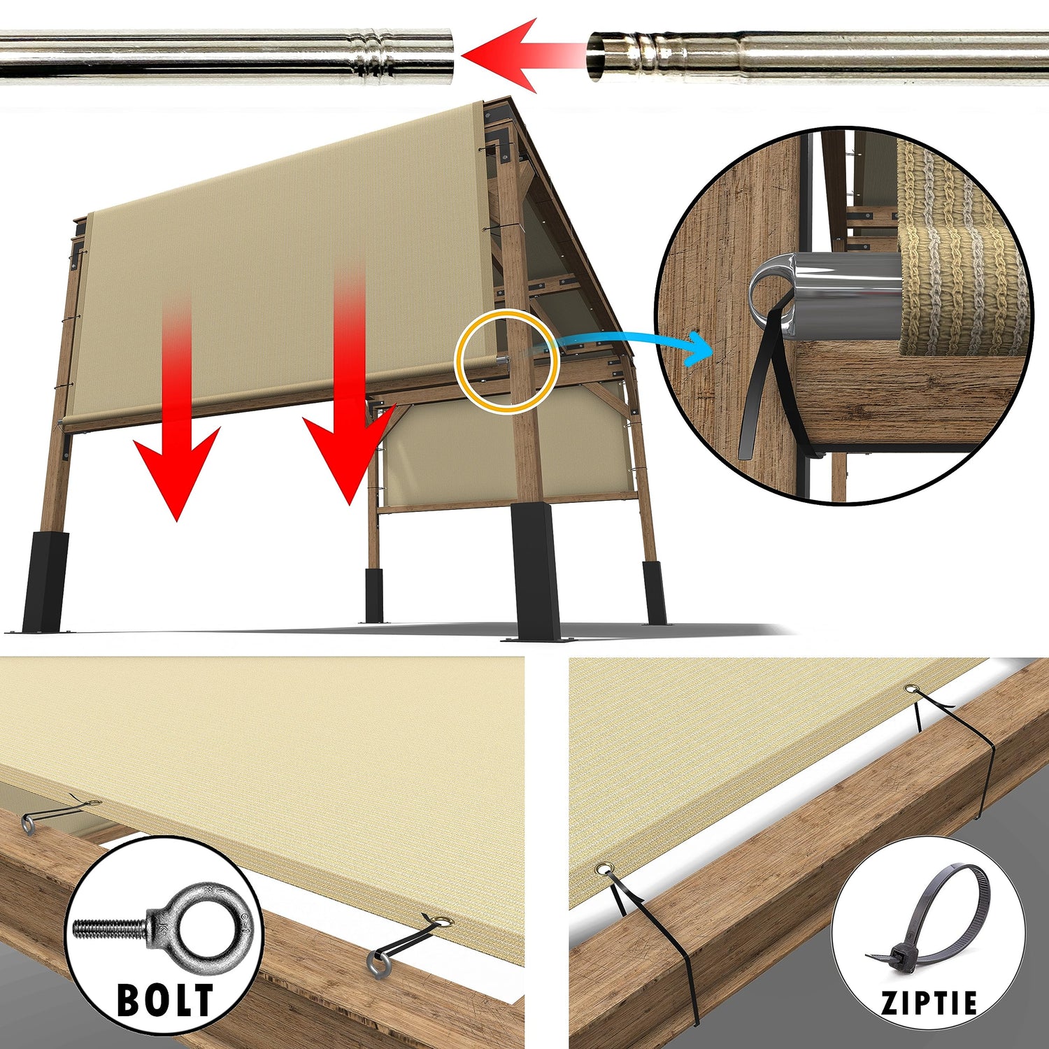 • √ Easy Installation & Secure Fit: Installing the Pergola Cover is a breeze with grommets placed every 2 ft. The high-quality stainless steel rods ensure stability and a sleek drape, giving your pergola a flawless finish.