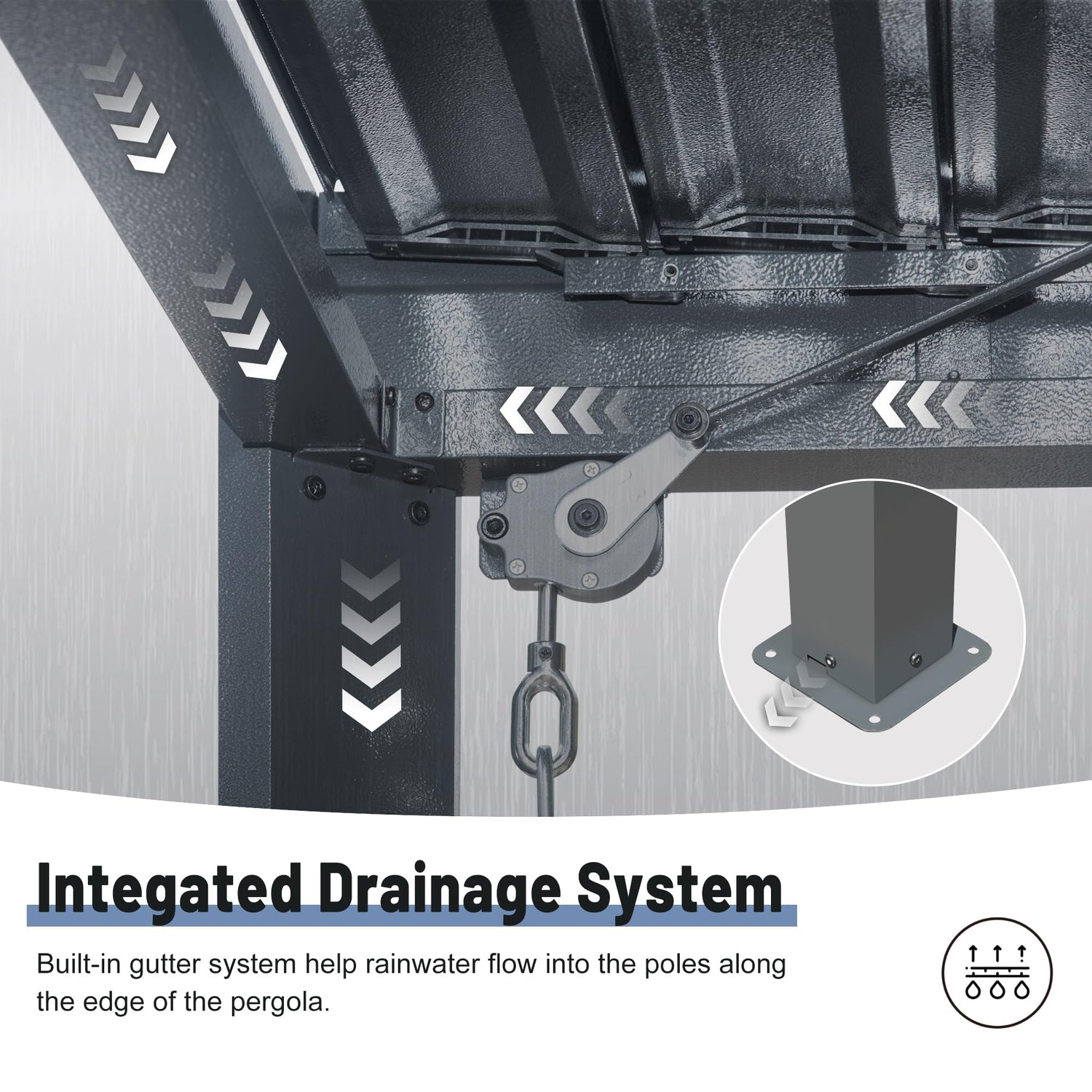 • Built-In Drainage System- Rainwater will be diverted to the columns through the built-in integrated drainage system, where it will be drained through the notches in the base of the posts.