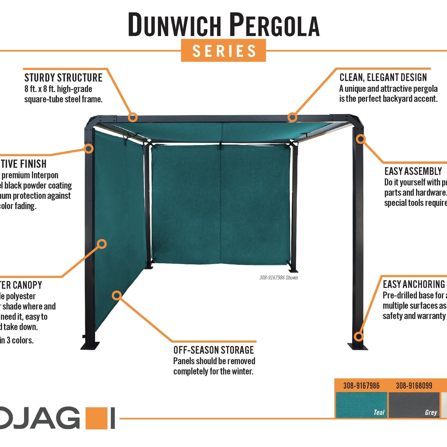 Details: Enjoy some shade how you want, where you want with the Sojag Dunwich Pergola. This compact pergola is ideal for small yards, rooftops, decks, or another outdoor space for some much-needed sun protection. With three fabric panels, you can customize your coverage to your liking- secure the top panel for some shade on bright days, and attach the side panels to ensure a little privacy from neighbors and passersby. Set-up and removal is easy- the side-release buckles make for quick, hassle-free assembly and maintenance. With a durable aluminum composite frame, this shelter can stand strong through any weather, year round. Interpon AzkoNobel powder coating prevents the structure from corroding, for a long-lasting pergola that you'll enjoy for years to come. While this is a year-round sun shelter, it is advised that the included fabric panels are removed in the winter. Assembly is required.