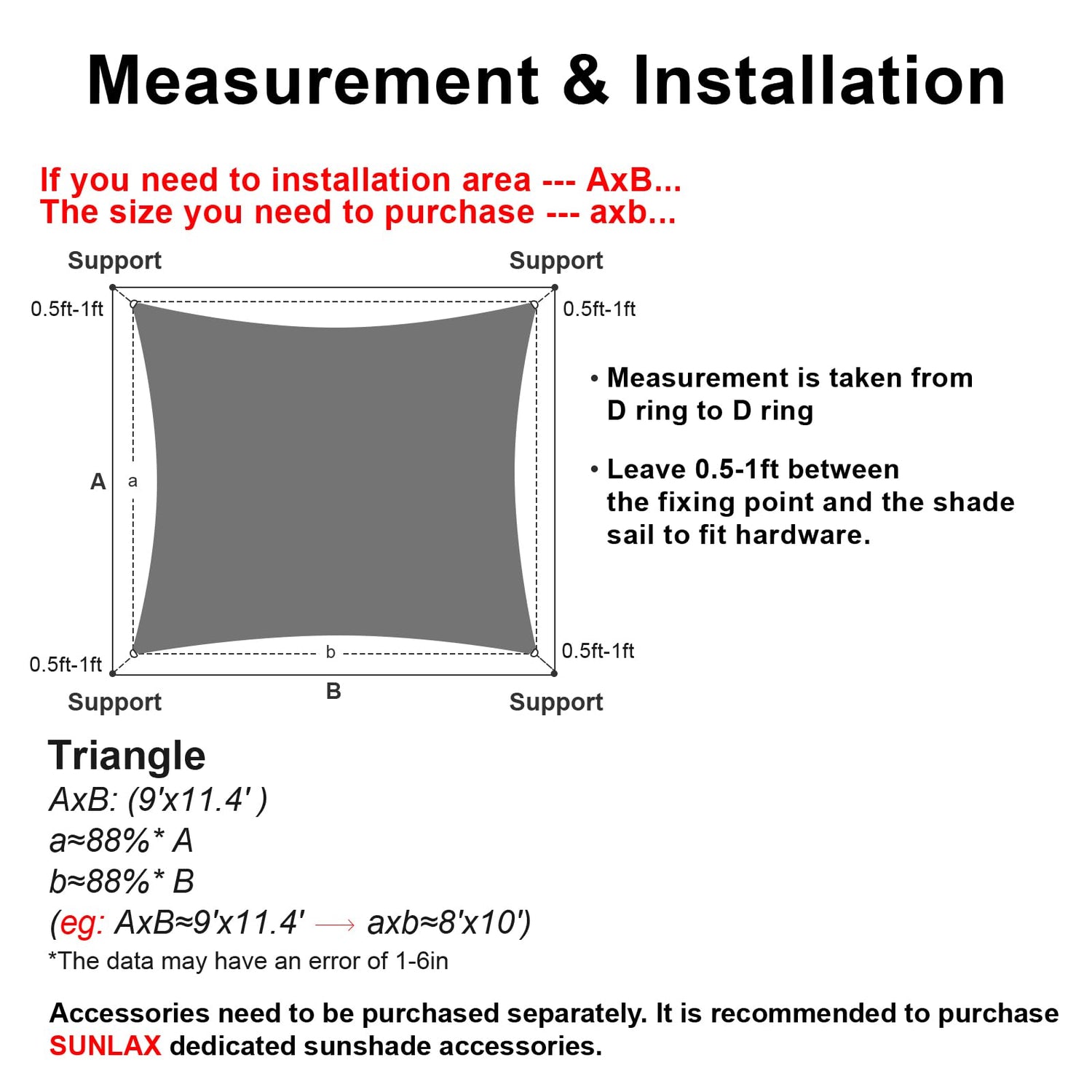 - 【EASY TO INSTALL】- Clean the area where the sail shade needs to be installed and measure. Leave 0.5-1 feet between the fixing point and the shade sails for mounting hardware/hook or rope. (Accessories must be purchased separately. It is recommended to purchase SUNLAX special sunshade accessories).