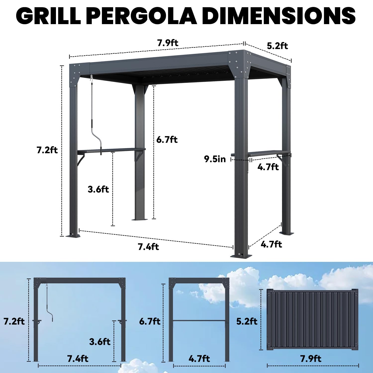 - 2 SIDE SHELVES: Reinforced with a sturdy triangular support, the 2 side shelves of the BBQ pergola offer enhanced load-bearing capacity. This design provides extra space to organize food, condiments, and grilling essentials, making your outdoor cooking experience more convenient
