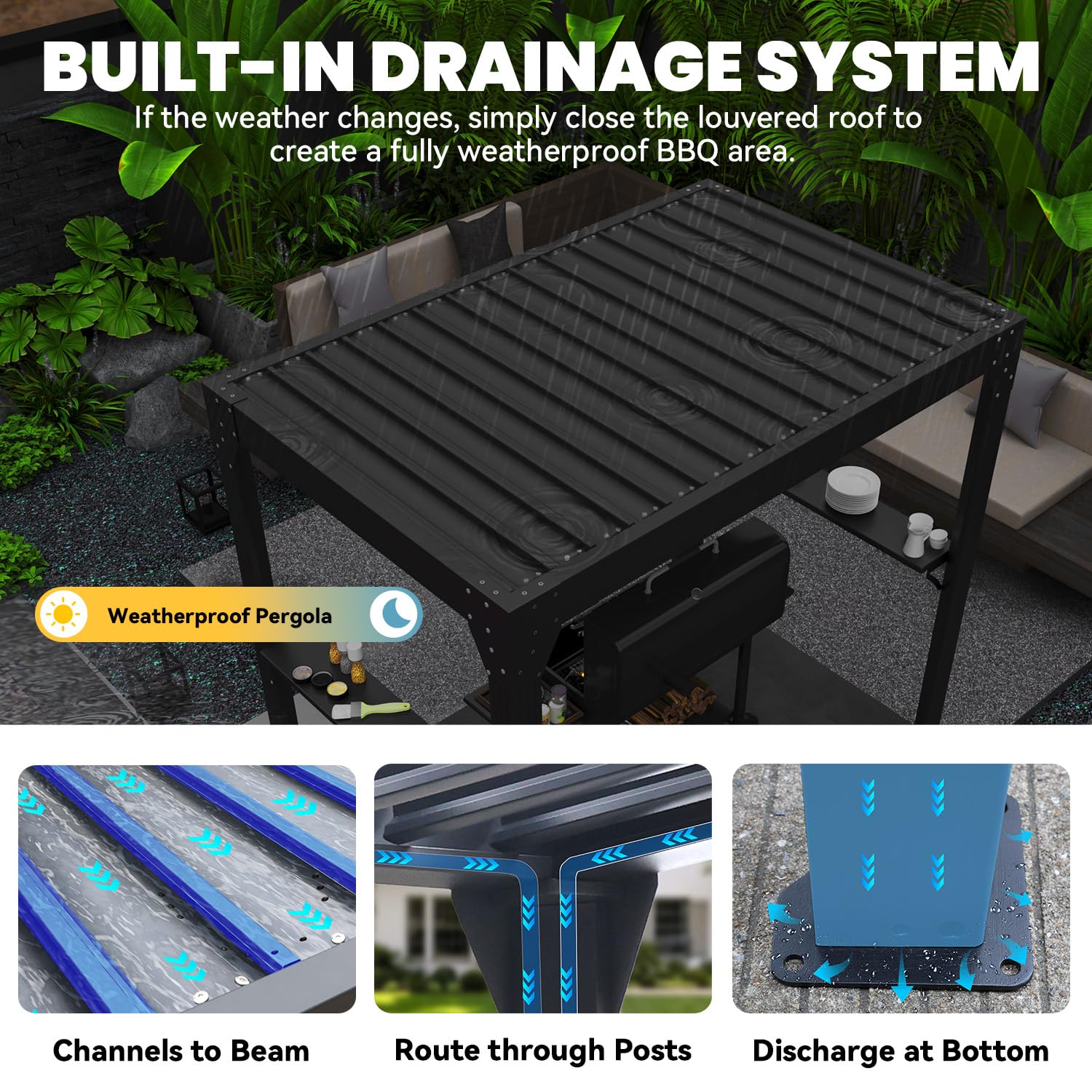 - DRAINAGE SYSTEM: Efficiently channels rainwater through drain gutters inside the beams and posts, preventing water buildup on the louvered pergola's surface. This system directs rainwater away, protecting your BBQ area from wind and rain, ensuring a dry, safe grilling space in any weather