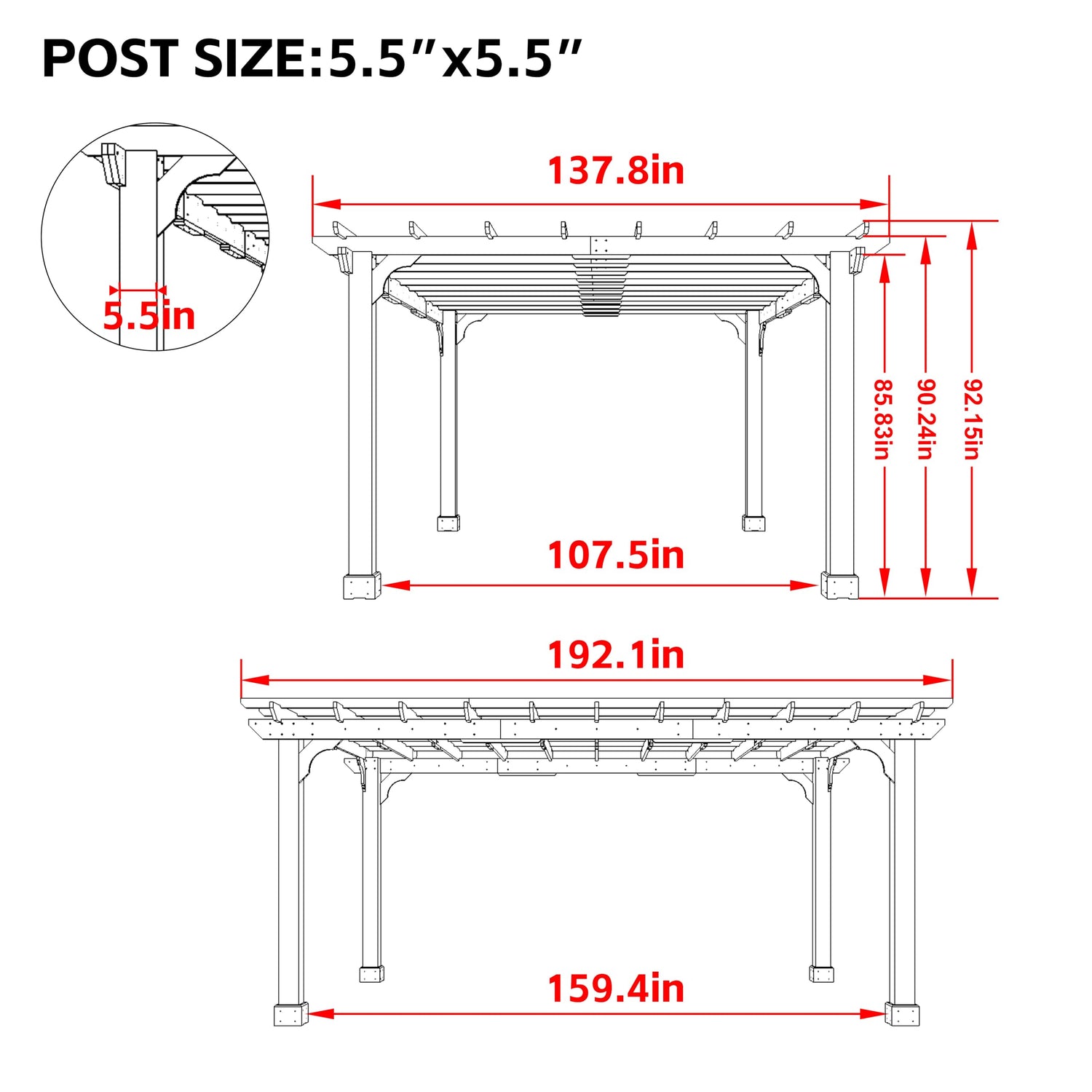 - Dimensions: Overall size: 192.1" L x 137.8" W x 92.15" H. Interior size: 159.4" L x 107.5" W x 85.83" H. Maximum entrance height: 85.83 inches. Post size: 5.5" x 5.5"
