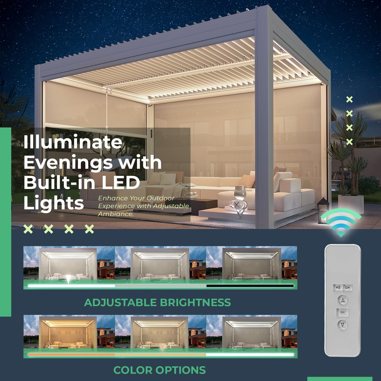 - ELECTRIC INNOVATION: With our integrated post controller and remote controller, you have complete control over 4 screens, LED lighting, and louvered roof shutters at the touch of a button. The pull-down screen, providing weather resistance against wind, rain, and sunlight, is easily adjustable with just a touch, allowing for individual or simultaneous control of all screens. The built-in LED light strips offer adjustable brightness and color settings.